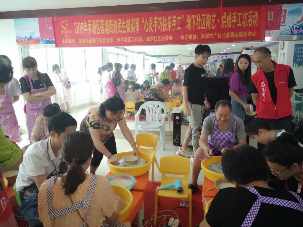 为进一步提高社区广大居民对健康、生活的追求,培养居民对陶艺、手工烘焙的兴趣与爱好,坳下社区党委、工作站、居委会联合深圳市广弘公益事业服务中心,于2019年9月5日下午,在坳下社区党群服务中心6楼开展民生微实事“心灵手巧快乐手工”坳下社区陶艺·烘焙手工坊活动(第四场),营造社区居民沟通交流平台,全面提升社区居民幸福指数。