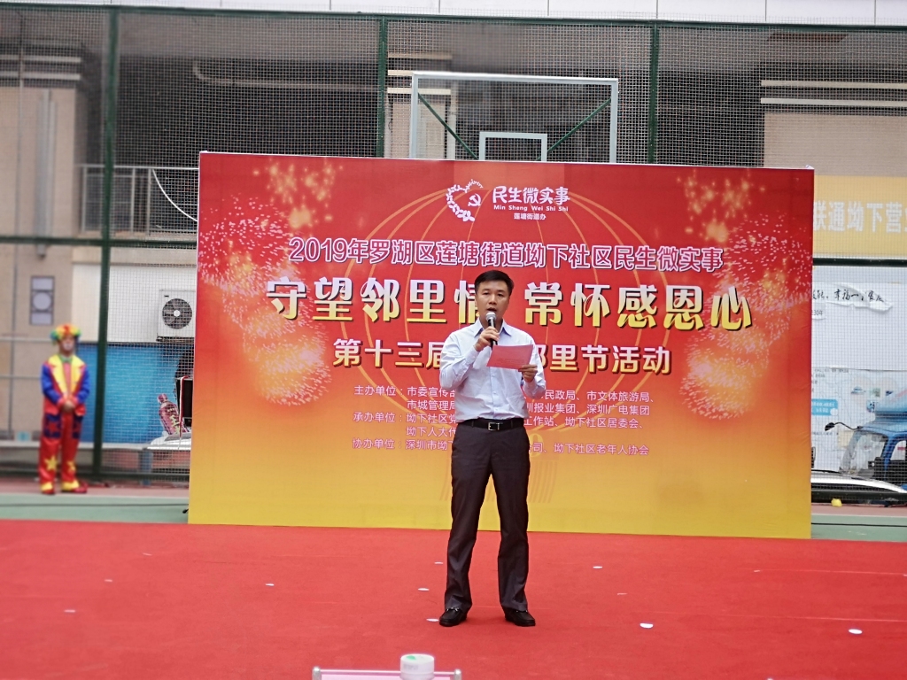为丰富社区居民精神文化生活,营造和谐睦邻社区的良好氛围,增加居民对社区的归属感和认同感,构建温馨、和睦、友爱的邻里关系。2019年10月29日下午,坳下社区党委、坳下社区居委会、坳下社区工作站、坳下人大代表社区联络站联合深圳市环宇社区公益事业服务中心,在坳下文化广场举办深圳市第十三届社区邻里节“守望邻里情常怀感恩心”活动。坳下人大代表社区联络站驻站代表、莲塘街道党工委副书记、人大工委主任谭启辉、社区第一书记罗远航、社区党委书记杨春丽、社区党代表陈惠容、坳下股份公司董事长邓伟平等出席活动,和社区居民欢聚一堂共度“守望邻里情常怀感恩心”邻里节活动。