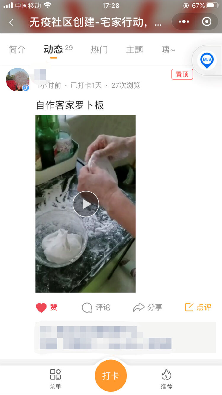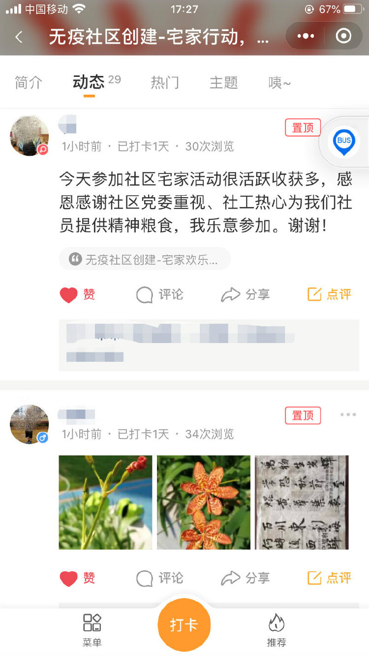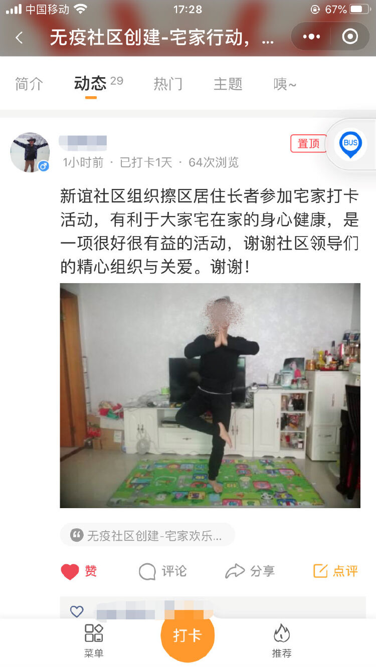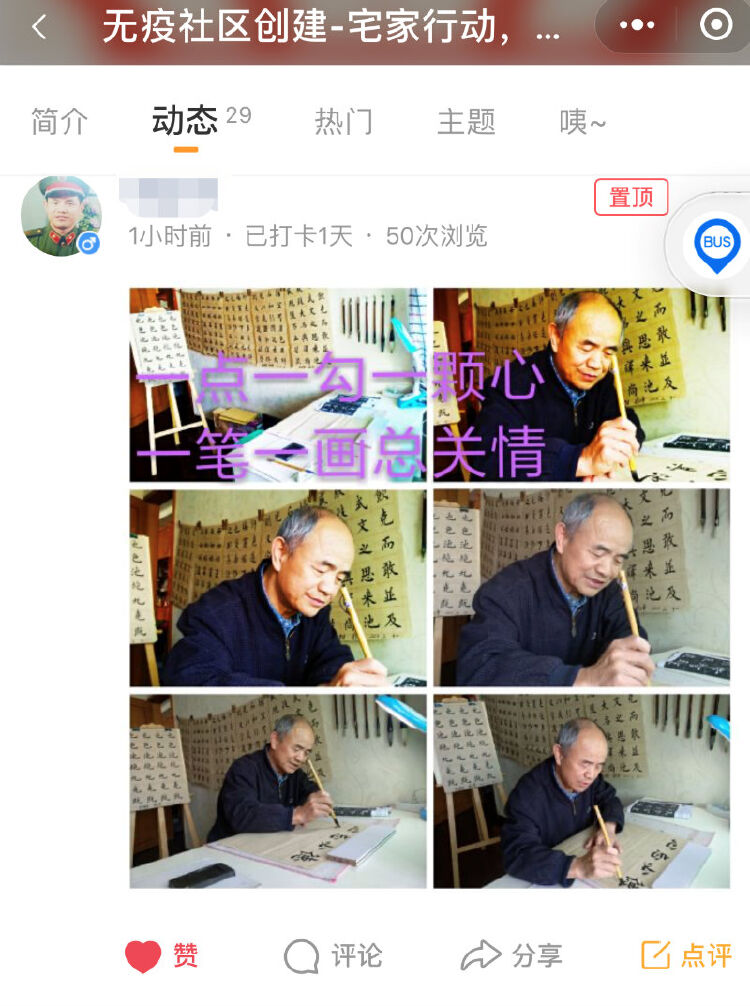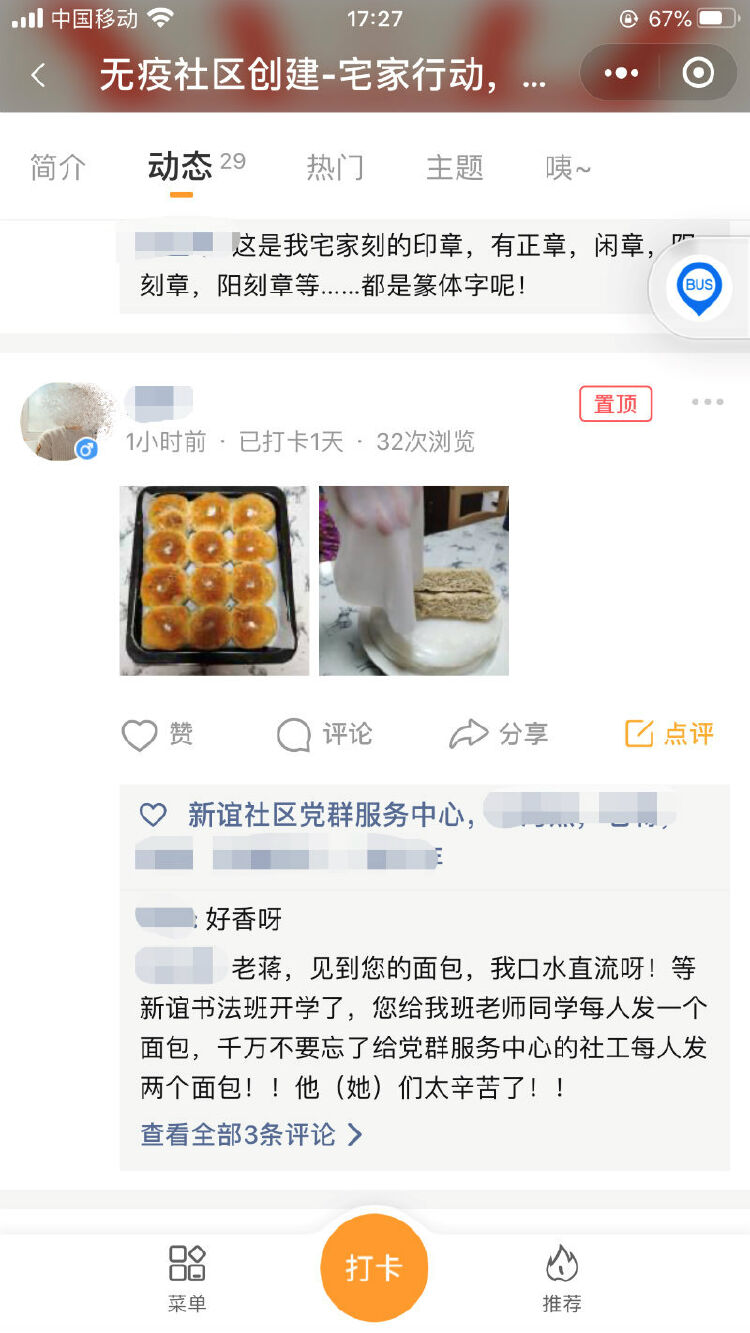 受新冠肺炎疫情影响,社区大部分老年人只能宅在家中,锻炼身体、参与户外活动受到限制。新谊党群服务中心联合鹏星社工建立了社区老年人宅家行动线上群,通过线上热身小游戏和有奖问答,让老年人学习防疫知识,锻炼反应能力。社工通过打卡小程序,指导老年人加入宅家行动小打卡圈子并完成打卡,分享防疫期间的居家活动来舒缓压力,大家你一言我一语,情绪高涨。各种室内运动包括健身、美食制作、家乡美景分享、书法绘画切磋等等,许多老年人学会小打卡后纷纷加入圈子,络绎不绝地相互交流。