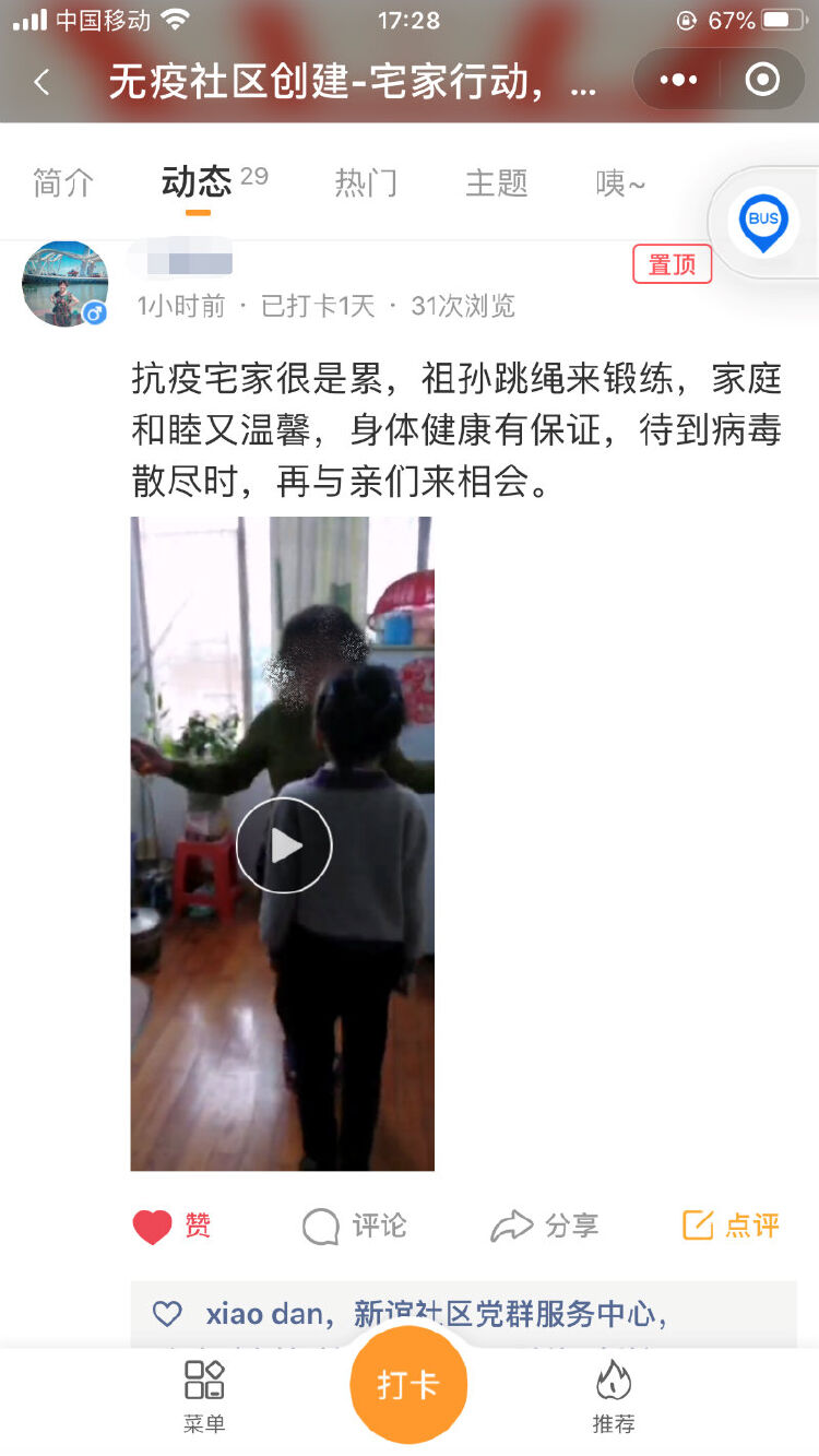 宅家行动小打卡得到了参与者的一致好评,新谊社区的老人们通过各种线上渠道将交流学习到的居家减压方式在朋友圈分享,让更多的老年朋友宅家欢乐多,为创建无疫小区做贡献。