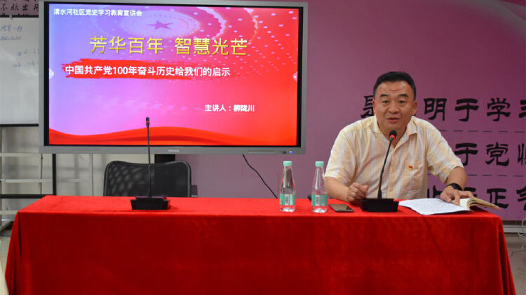 会议特邀清水河街道两新党工委副书记柳陇川授课,他带领全体党员重温了中国共产党伟大光辉的奋斗历程和近百年来波澜壮阔的绚丽篇章。