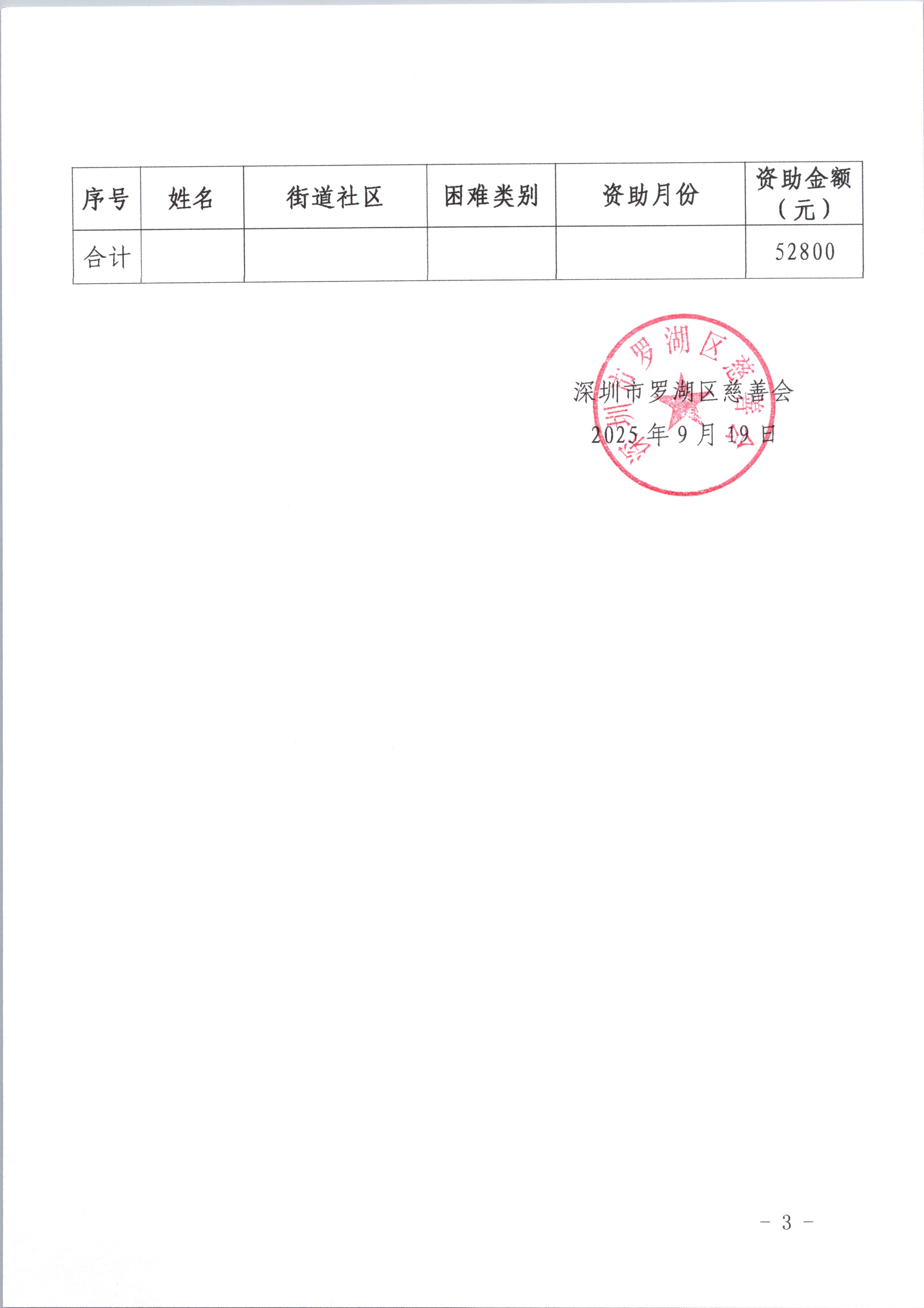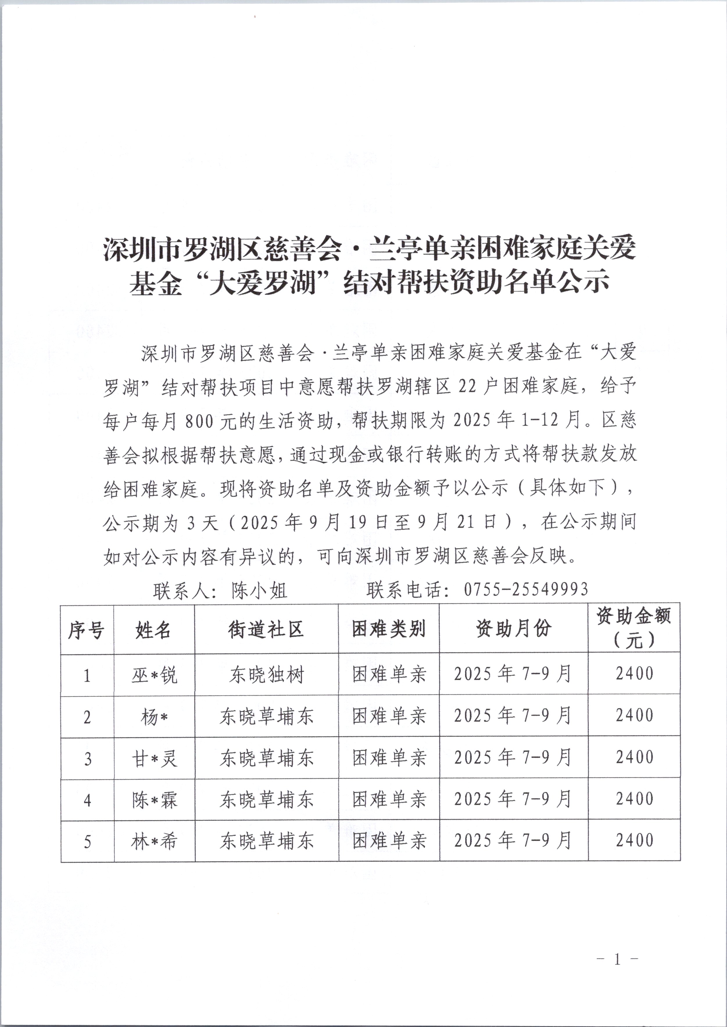 深圳市罗湖区慈善会·兰亭单亲困难家庭关爱基金在“大爱罗湖”结对帮扶项目中意愿帮扶罗湖辖区22户困难家庭,给予每户每月800元的生活资助,帮扶期限为2025年1-12月。区慈善会拟根据帮扶意愿,通过现金或银行转账的方式将帮扶款发放给困难家庭。现将资助名单及资助金额予以公示,具体如下: