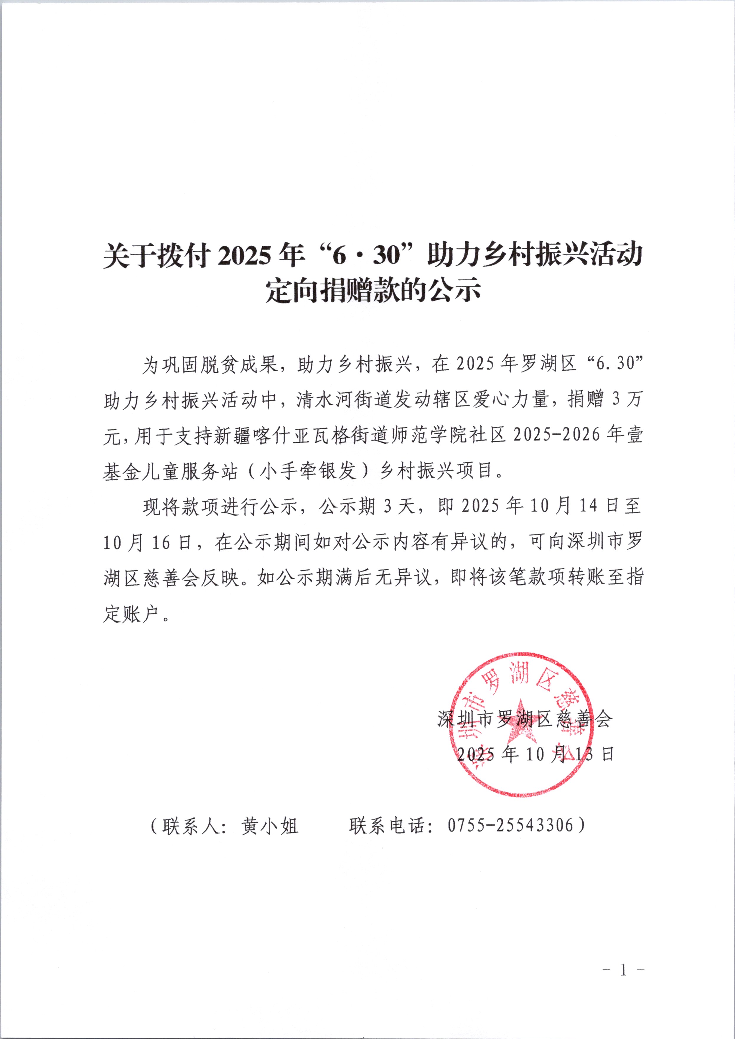 为巩固脱贫成果,助力乡村振兴,在2025年罗湖区“6.30”助力乡村振兴活动中,清水河街道发动辖区爱心力量,捐赠3万元,用于支持新疆喀什亚瓦格街道师范学院社区2025-2026年壹基金儿童服务站(小手牵银发)乡村振兴项目。