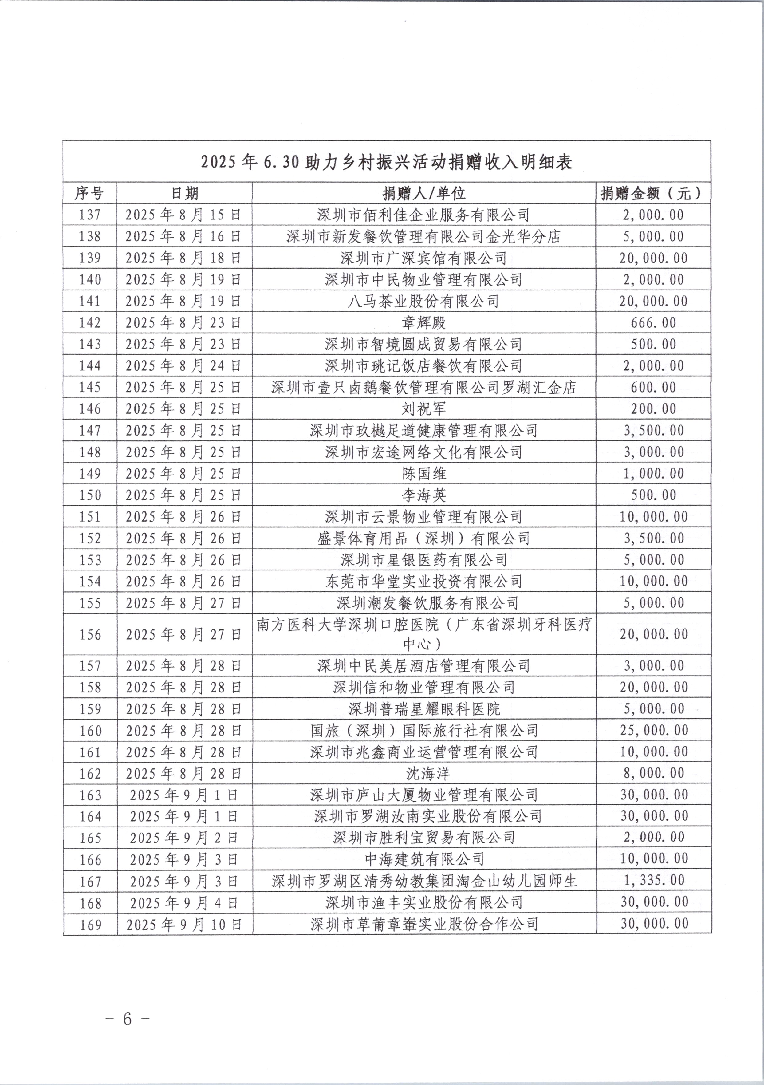罗湖区慈善会作为罗湖区“6·30”助力乡村振兴活动指定的捐款接收单位,截至2025年10月30日,区慈善会共募集接收2025年“6·30”助力乡村振兴活动专项资金1,956,015.59元,支出400,000.00元,结余1,556,015.59元。此次活动募集的资金全部用于巩固脱贫成果、促进乡村全面振兴的各项事业。现将2025年“6·30”助力乡村振兴活动捐款明细予以公示,接受捐赠者和社会各界的监督。具体如下: