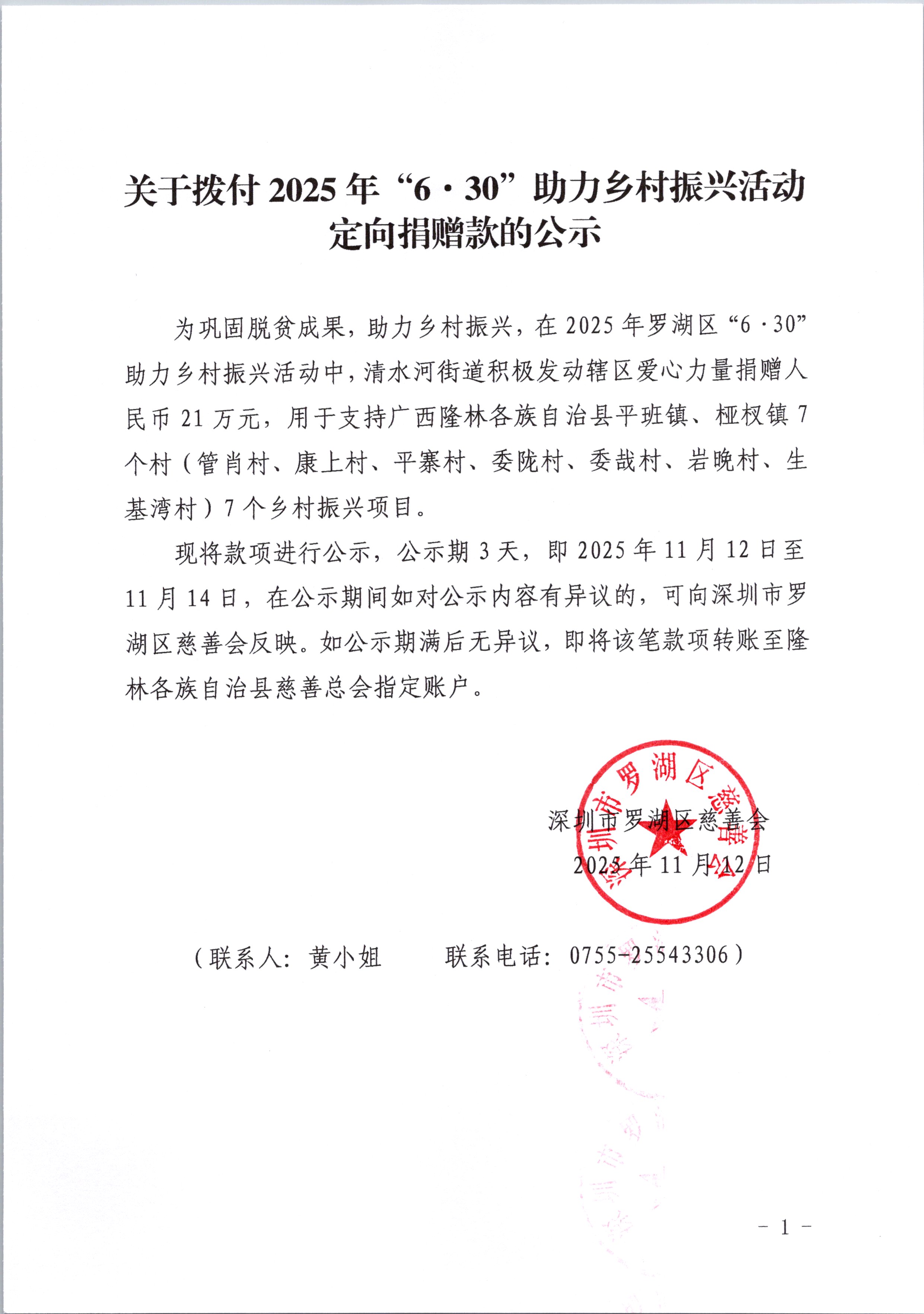 为巩固脱贫成果,助力乡村振兴,在2025年罗湖区“6·30”助力乡村振兴活动中,清水河街道积极发动辖区爱心力量捐赠人民币21万元,用于支持广西隆林各族自治县平班镇、桠杈镇7个村(管肖村、康上村、平寨村、委陇村、委哉村、岩晚村、生基湾村)7个乡村振兴项目。