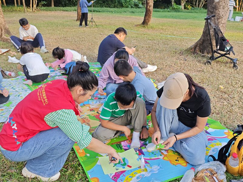 本次活动创新采用“把书翻到户外去”的形式,带领亲子家庭走进自然,在清新空气中共享阅读时光。陈老师以环保绘本《拯救地球的孩子们》为引,生动讲述地球生态面临的挑战。“为什么北极熊的家在变小?”“看到乱扔垃圾怎么办?”一个个贴近生活的问题引发孩子们热烈回应:“垃圾要分类!”“空调开到26度最省电!”童声清脆,回答坚定,现场掌声不断。家长们也踊跃加入,分享日常节能节水、低碳出行的心得,气氛温馨而活跃。随后的“保护地球粘贴画”环节中,亲子家庭在社工引导下默契配合:妈妈们细心拼贴“海洋”与“森林”,孩子们巧手点缀“树叶”与“花朵”,共同描绘心中的绿色家园。为鼓励孩子们将环保理念转化为日常行动,社工向亲子家庭发放“环保小卫士召集令”,号召大家从身边小事做起,争当环保行动的实践者。活动结束后,家长李女士欣喜地分享:“孩子以前常浪费纸张,现在主动说要节约用纸。这种寓教于乐的方式,比我们反复说教有效多了!”八岁的东东也认真说道:“我知道了不能乱扔垃圾,还要和大家一起守护地球!”