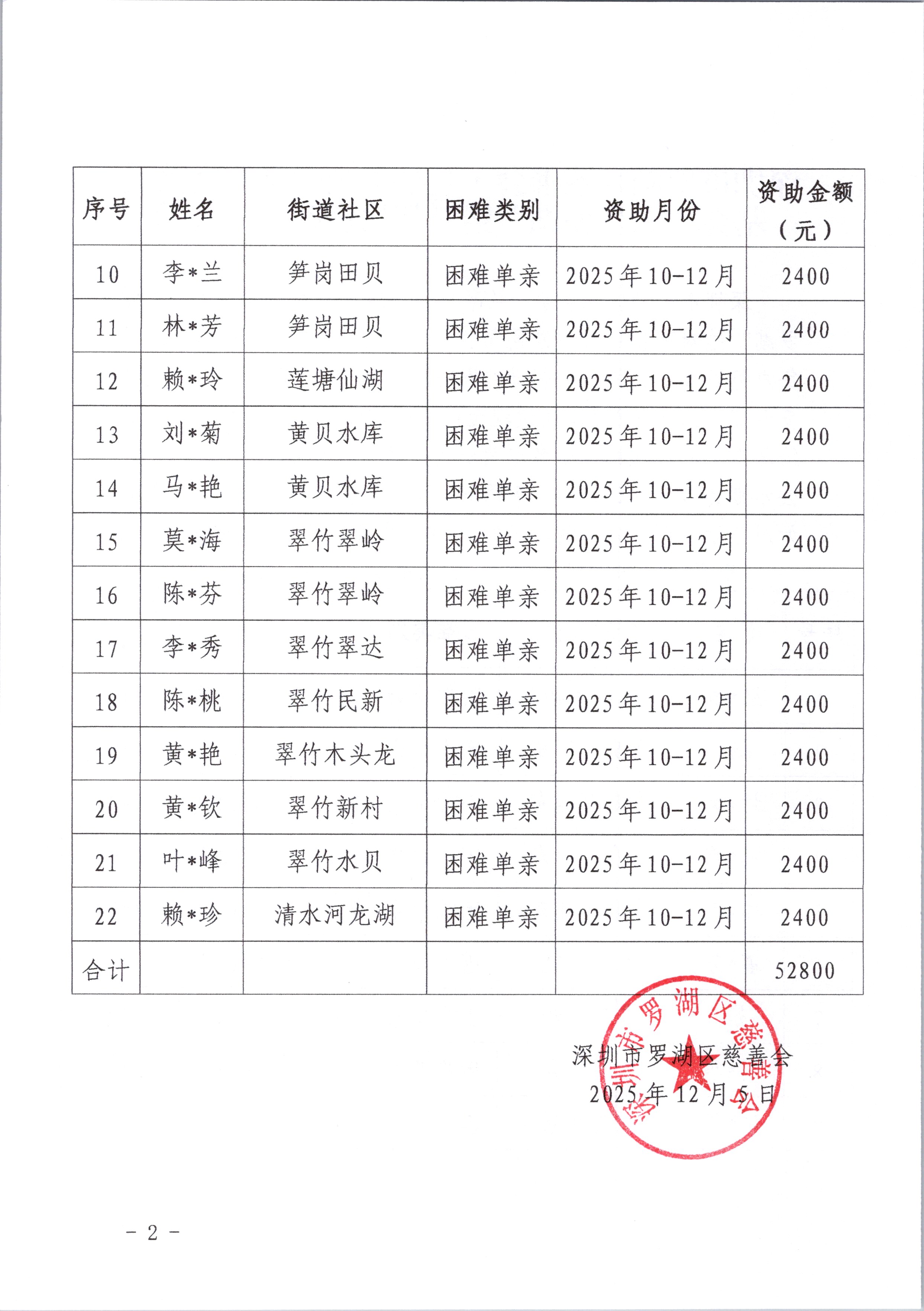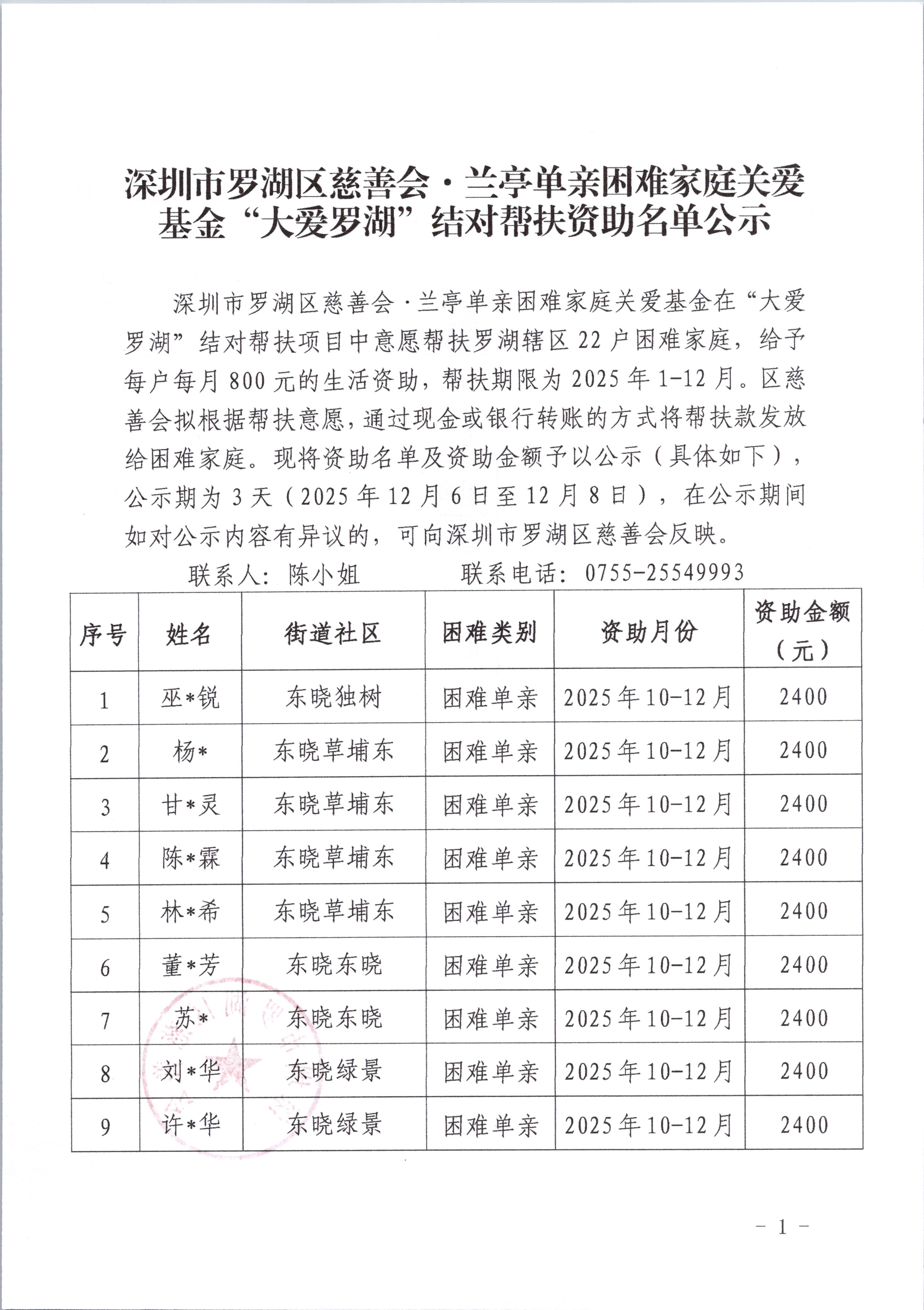 深圳市罗湖区慈善会·兰亭单亲困难家庭关爱基金在“大爱罗湖”结对帮扶项目中意愿帮扶罗湖辖区22户困难家庭,给予每户每月800元的生活资助,帮扶期限为2025年1-12月。区慈善会拟根据帮扶意愿,通过现金或银行转账的方式将帮扶款发放给困难家庭。现将资助名单及资助金额予以公示,具体如下: