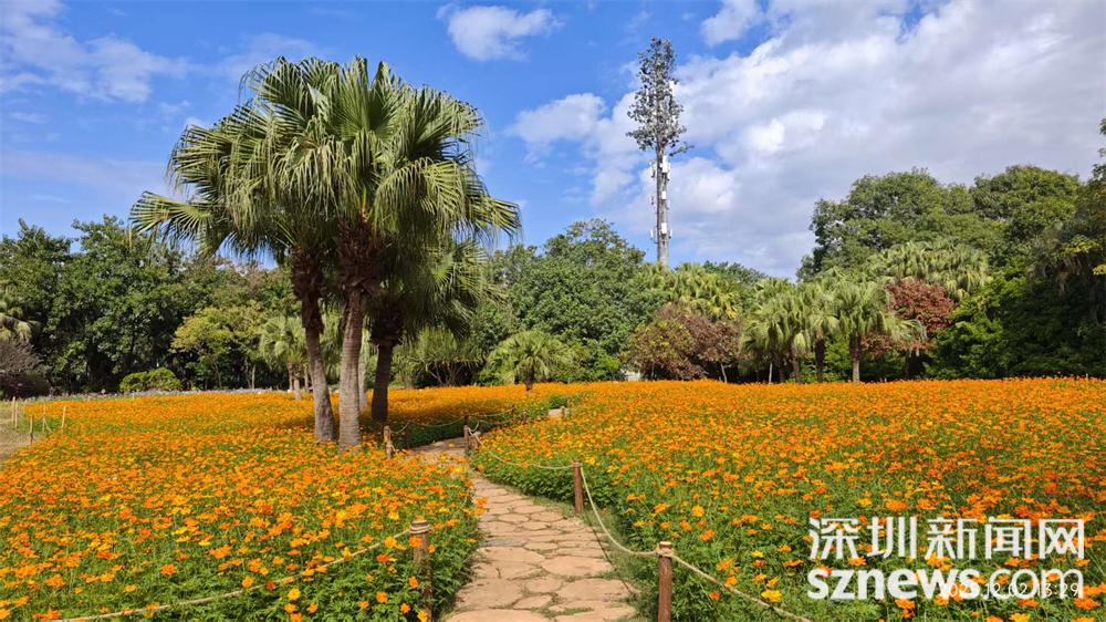 花木园内近1000平方米的硫华菊花海,金黄花朵随风起伏,宛如金色波浪。
