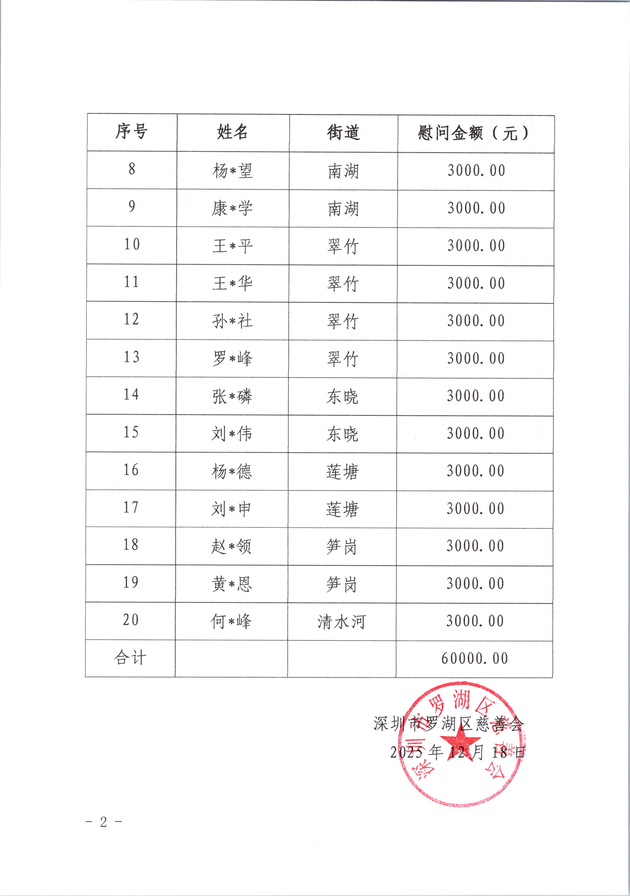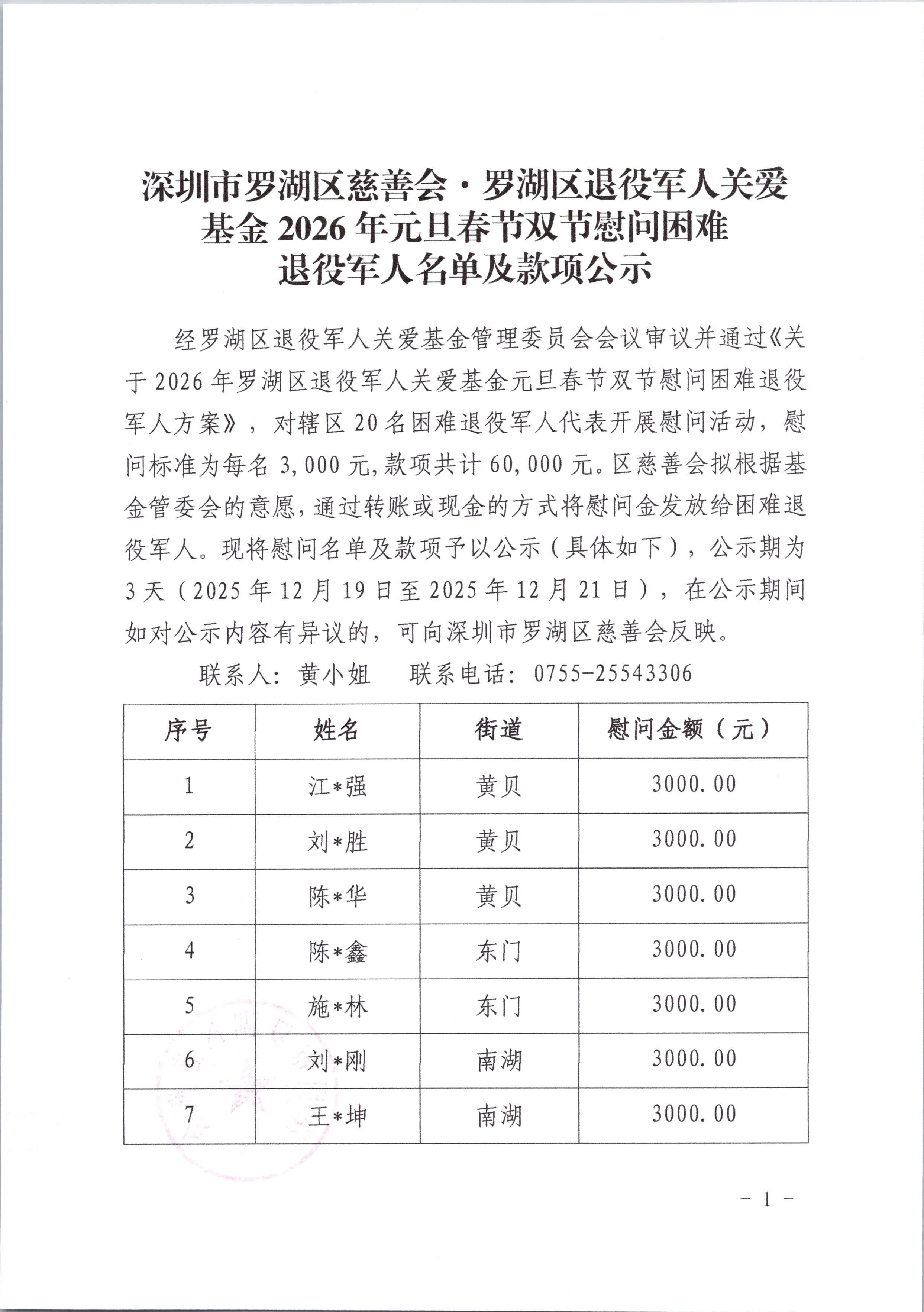 经罗湖区退役军人关爱基金管理委员会会议审议并通过《关于2026年罗湖区退役军人关爱基金元旦春节双节慰问困难退役军人方案》,对辖区20名困难退役军人代表开展慰问活动,慰问标准为每名3,000元,款项共计60,000元。区慈善会拟根据基金管委会的意愿,通过转账或现金的方式将慰问金发放给困难退役军人。现将慰问名单及款项予以公示,具体如下:
