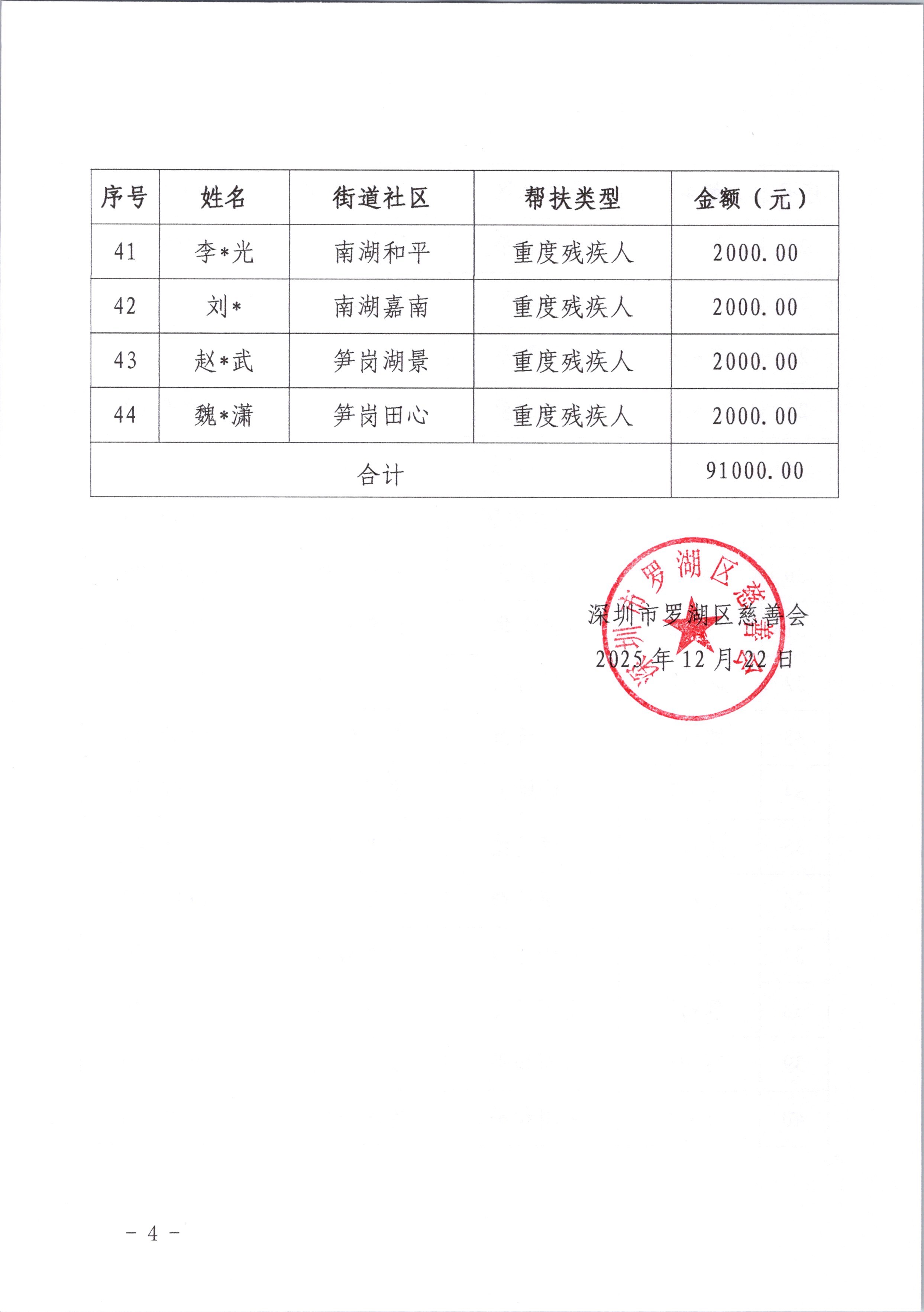 为关心关爱辖区困难残疾人,罗湖区残联联合区慈善会共同开展“罗湖区困难残疾人帮扶行动项目”,为辖区一户多残、重疾、单亲、孤寡、重度残疾等不同类型的困难残疾人及其家庭提供精准、有效的资金帮扶。经区残联摸排、收集、审核,2025年符合帮扶条件的残疾人共44名,帮扶总金额91,000元。