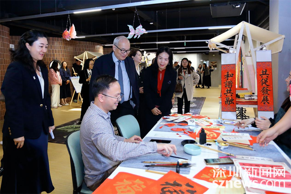 启动仪式后,嘉宾们来到区妇儿大厦三楼,参观深港家庭综合服务中心。深港家庭志愿者们精心陈列了过往活动中的手工作品,现场演示书法课成果;跨境妈妈们联手制作港式奶茶与点心,热情款待每位来宾;跨境家庭将感恩的心意化作书信与卡片,装点大厅中央的吊灯,成为全场的温暖焦点。深港家庭综合服务中心作为国际及湾区交流平台的重要依托,其焕新升级的环境和专业规划的服务空间,让大家对平台未来的实际运作与服务成效充满期待。