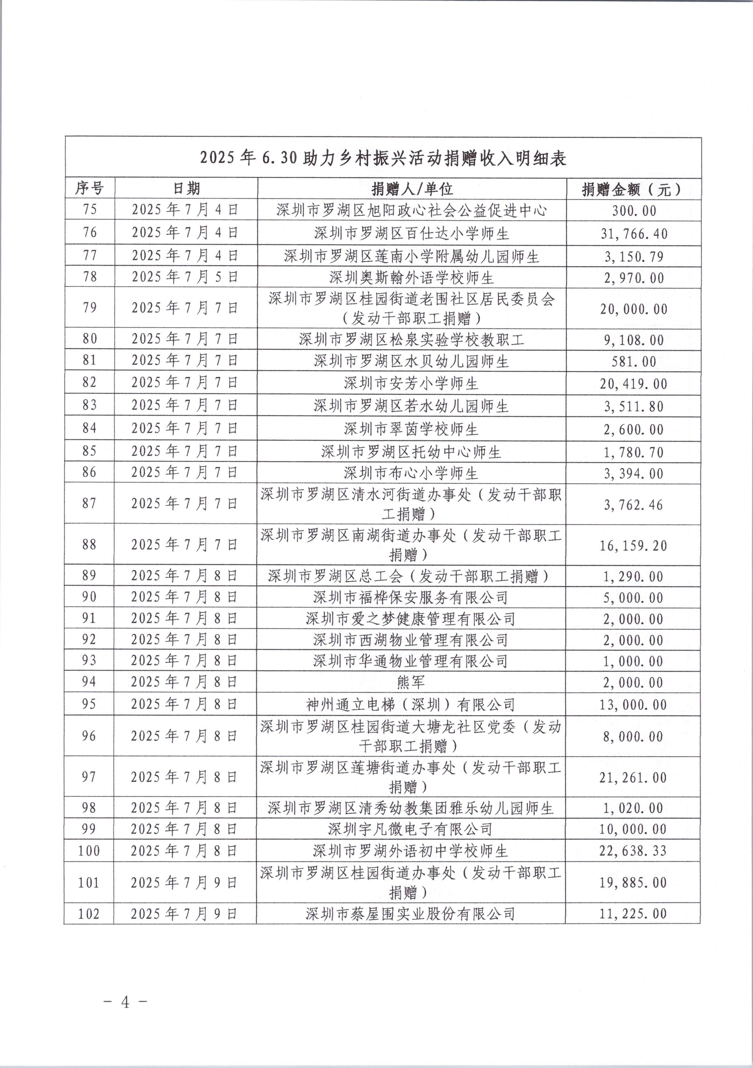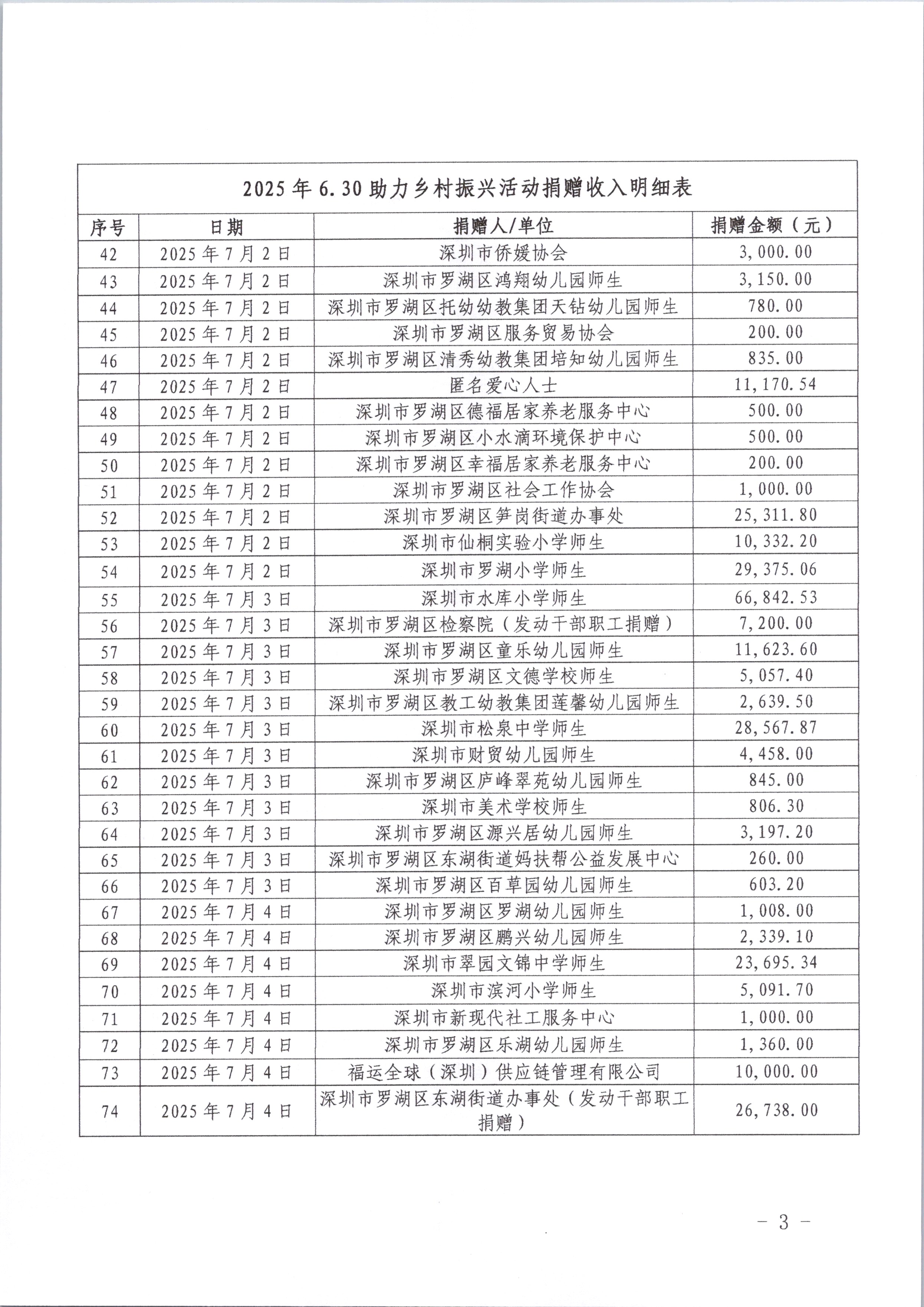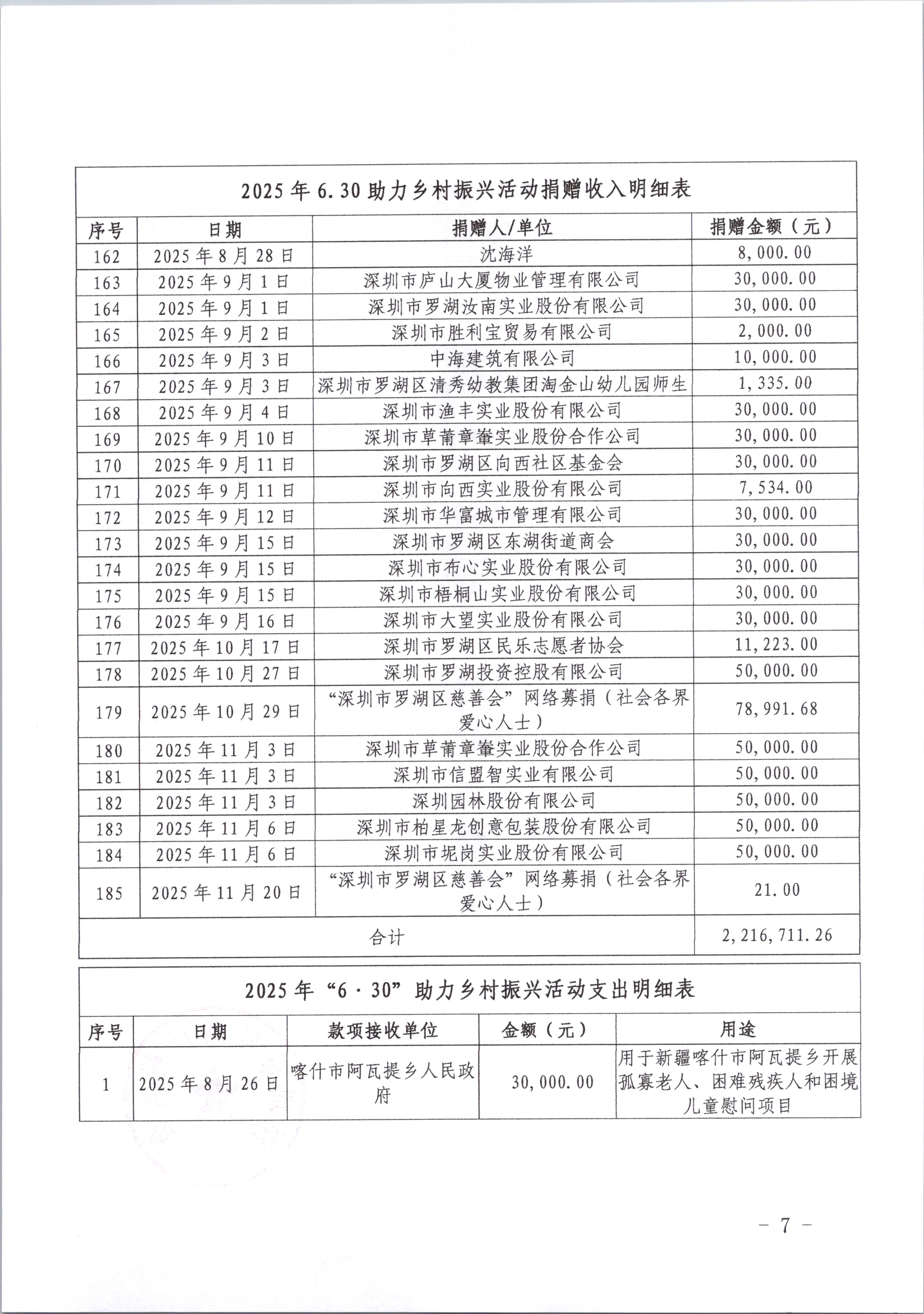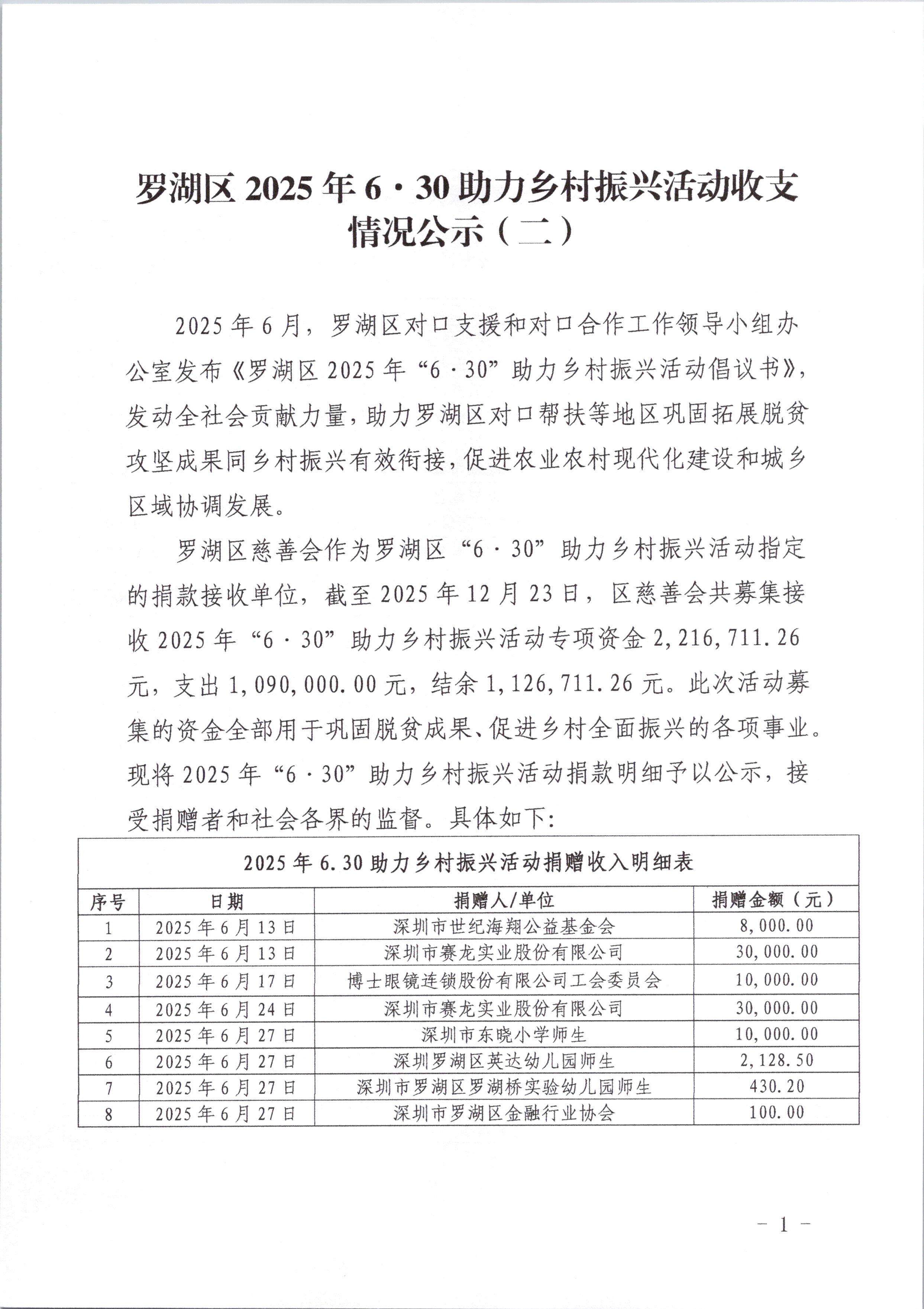 罗湖区慈善会作为罗湖区“6·30”助力乡村振兴活动指定的捐款接收单位,截至2025年12月23日,区慈善会共募集接收2025年“6·30”助力乡村振兴活动专项资金2,216,711.26元,支出1,090,000.00元,结余1,126,711.26元。此次活动募集的资金全部用于巩固脱贫成果、促进乡村全面振兴的各项事业。现将2025年“6·30”助力乡村振兴活动捐款明细予以公示,接受捐赠者和社会各界的监督。具体如下: