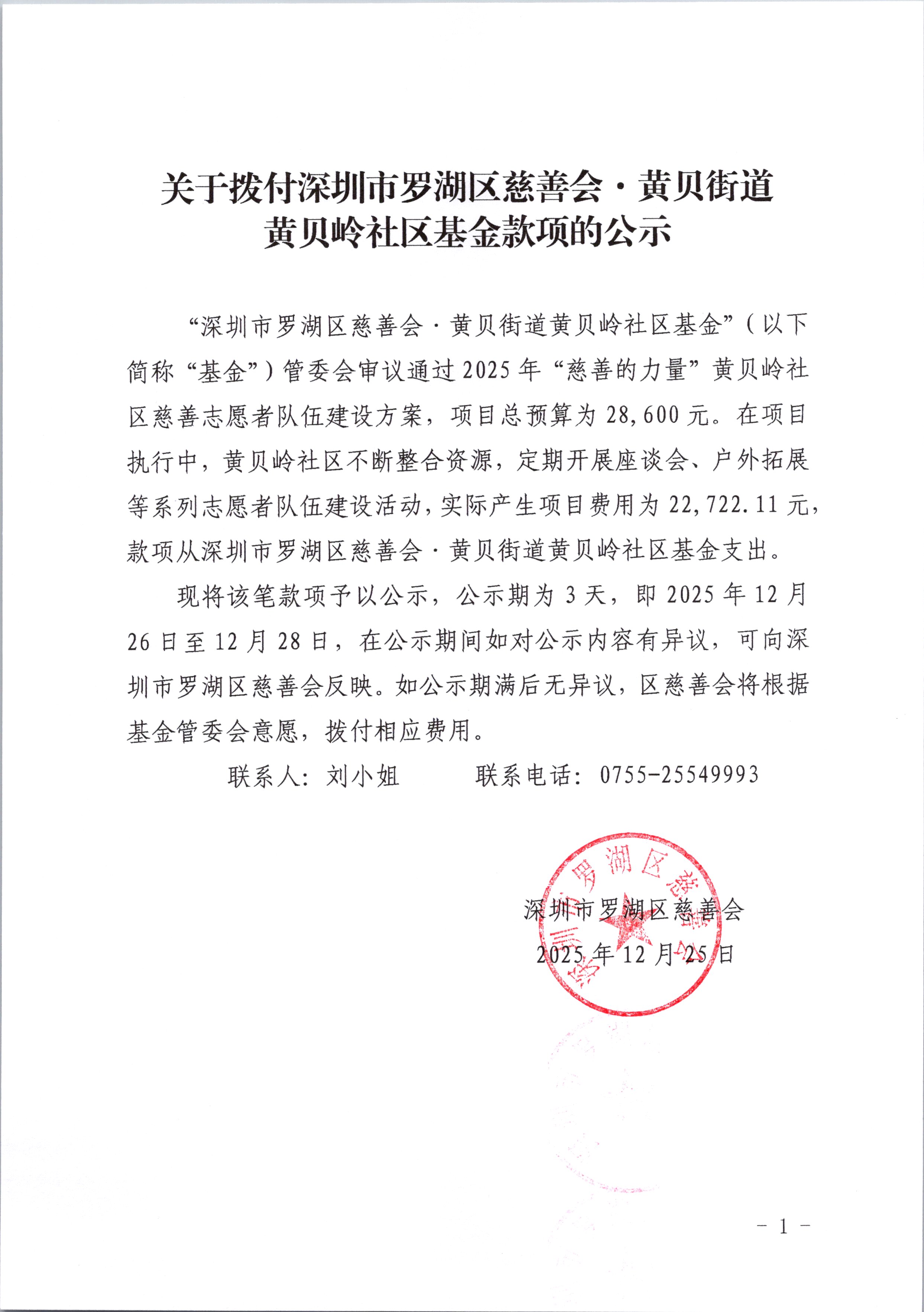 “深圳市罗湖区慈善会·黄贝街道黄贝岭社区基金”(以下简称“基金”)管委会审议通过2025年“慈善的力量”黄贝岭社区慈善志愿者队伍建设方案,项目总预算为28,600元。在项目执行中,黄贝岭社区不断整合资源,定期开展座谈会、户外拓展等系列志愿者队伍建设活动,实际产生项目费用为22,722.11元,款项从深圳市罗湖区慈善会·黄贝街道黄贝岭社区基金支出。