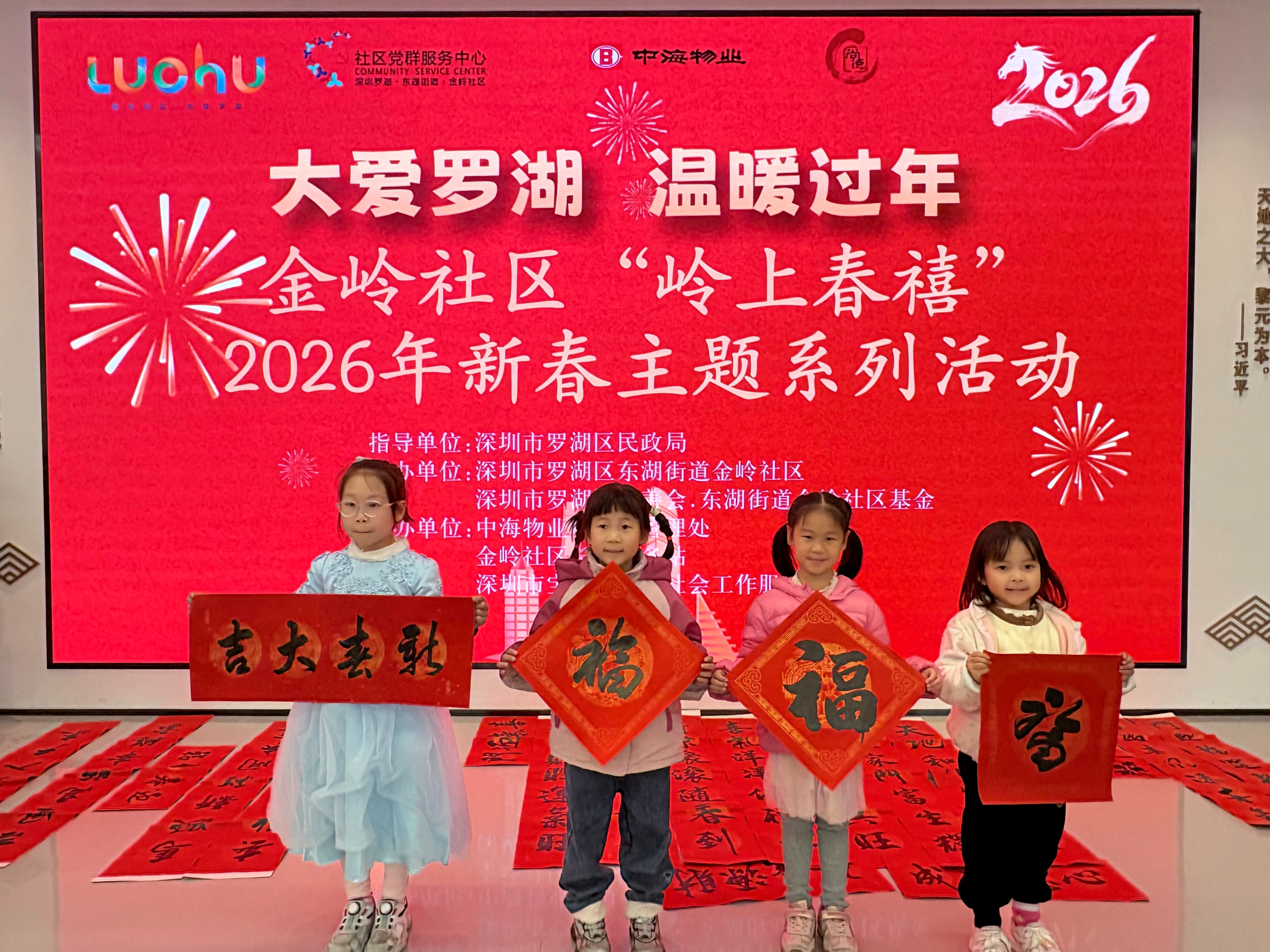 翰墨飘香,花灯添彩。东湖街道金岭社区在深圳市罗湖区慈善会・东湖街道金岭社区基金的支持下,开展“岭上春禧”2026年新春主题系列活动。现场邀请书法达人与爱好者挥毫泼墨,为居民免费书写春联、赠送“福”字;同时为社区儿童提供花灯制作材料,让他们在趣味手工中体验传统年俗魅力,将满满的年味与祝福带回家,为新春佳节增添欢乐祥和的喜庆氛围。