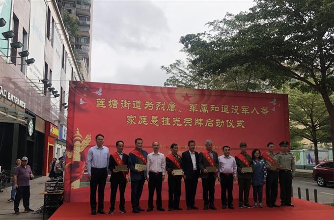 为弘扬拥军优属的优良传统,营造爱国拥军、尊崇军人、敬重英雄的浓厚氛围,做好为烈属、军属、退役军人等家庭悬挂光荣牌工作,弘扬新时代拥军优属优良传统,2019年4月4日上午,莲塘街道在万佳超市门口举办为军烈、军属和退役军人等家庭悬挂光荣牌启动仪式。坳下社区党委书记杨春丽参加启动仪式。