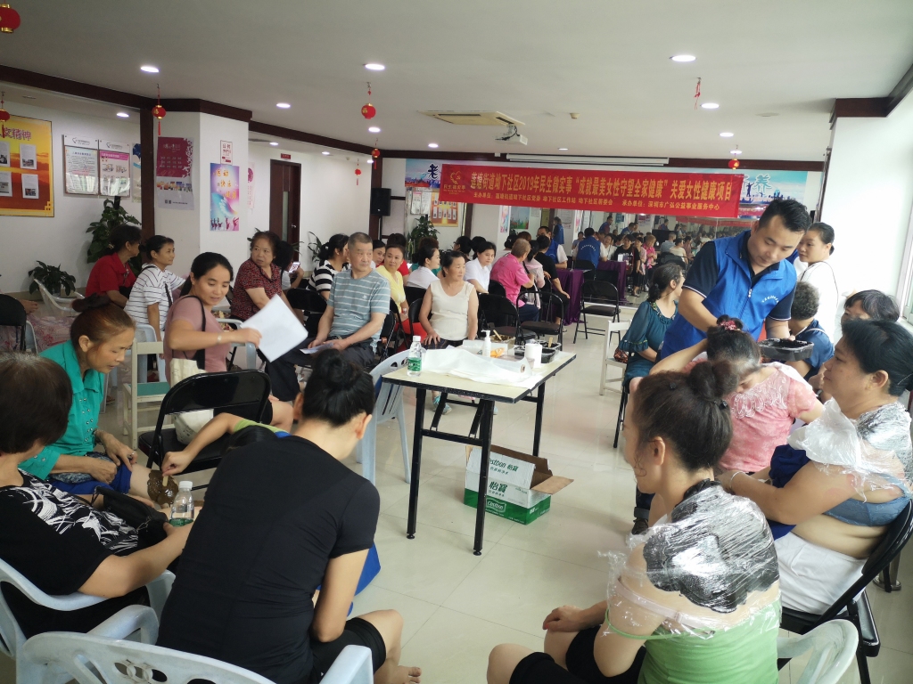 为了更好地服务社区女性居民群体,通过健康排查、健康调理、一对一健康指导的方式,坳下社区党委、工作站、居委会联合深圳市广弘公益事业服务中心于2019年9月3日下午,在坳下社区党群服务中心6楼开展民生微实事“成就最美女性守望全家健康”关爱女性健康项目活动(第三场),为社区女性居民改善身体亚健康问题,达到科普健康、普及健康知识、传递健康文化、做到人人享健康,促进健康与爱同行,创建幸福健康家园。