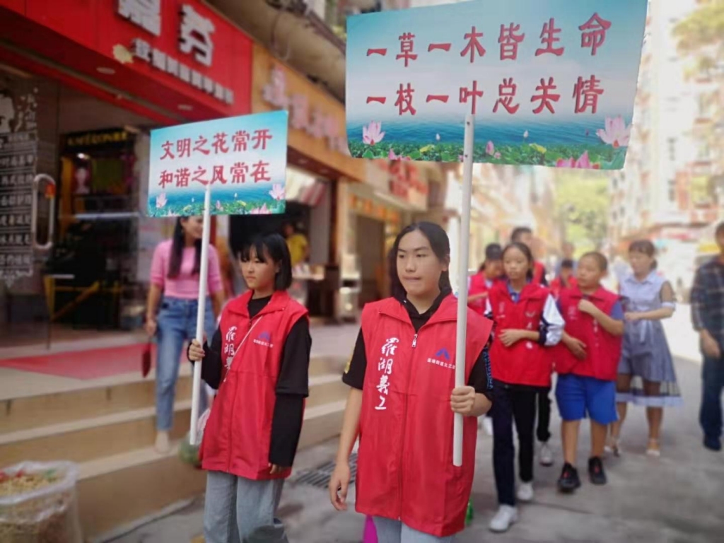 小小志愿者们在工作人员的带领下,从工作站出发,提着保洁袋、手拿垃圾钳、文明标语的牌子,在辖区主次干道、老旧住宅、市场等场所宣传环境卫生的重要性,清理沿途垃圾和废弃物,并向居民发放市民文明手册,得到过往居民纷纷点赞。