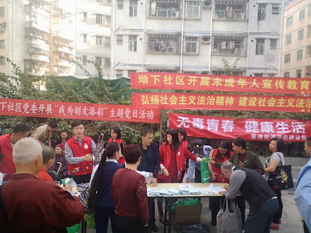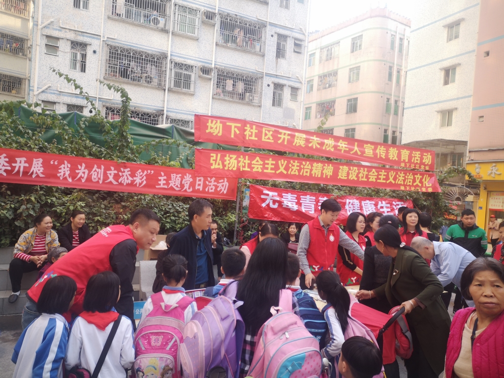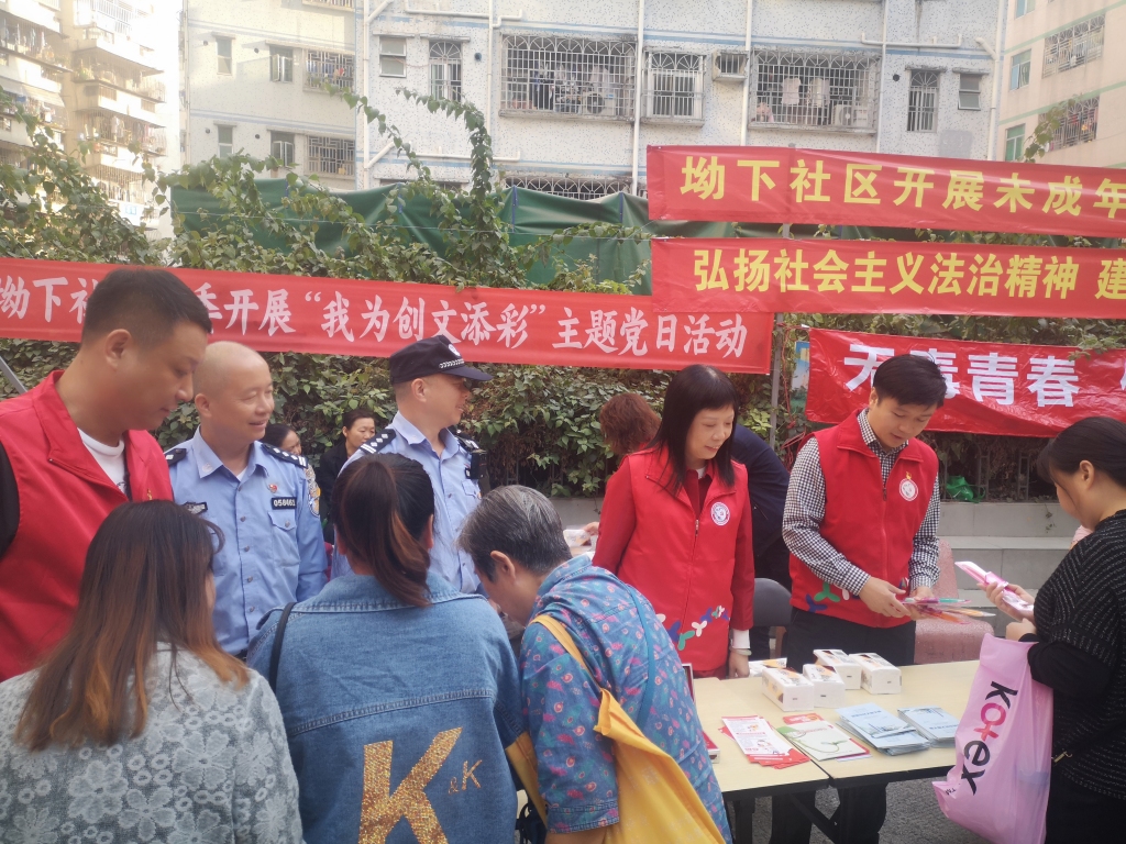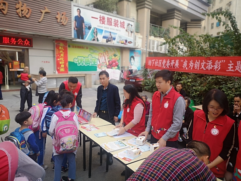 为提高辖区居民群众对创建全国文明城市工作的知晓率,提升社区居民参与创建文明城市的积极性,齐心协力共创全国文明城市的良好氛围,2019年11月20日下午,坳下社区党委在辖区开展“我为创文添彩”主题党日活动及未成年人宣传教育。