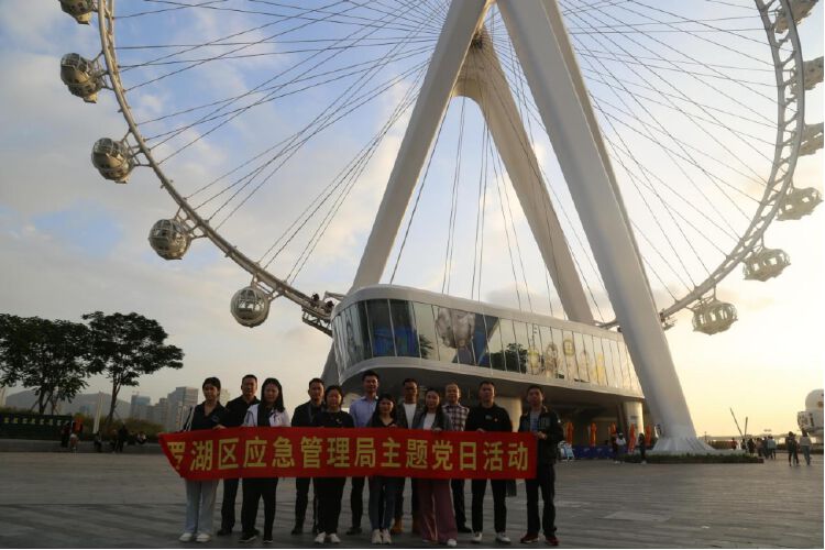 据了解,“湾区之光”摩天轮总高128米,28个进口轿厢,每个可容纳25人。如此大型的游乐设施该如何做好风险管控工作?为解答这一问题,党员们来到宝安区华侨城欢乐港湾,通过参观、体验“湾区之光”摩天轮的方式,学习大型游乐设施的安全风险管控经验。在欢乐港湾安全总监向军的陪同讲解下,党员们了解了“湾区之光”摩天轮的安全风险管控措施,内容包括如何使用双套系统、定期停运进行检查、人员有序疏散、特殊天气管控等,进一步提高党员们有关大型游乐设施安全管控能力及应急业务水平。