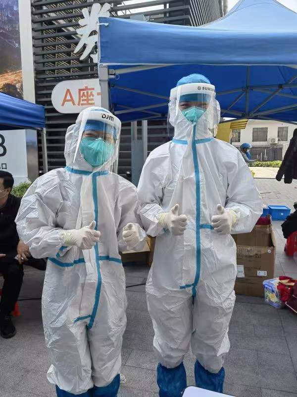 林蕙、佘汉基,这两个可爱的90后“大白”,穿上这身战服后,新奇和兴奋之情溢于言表,同时也有满满的敬畏和责任感,大太阳底下,市民手机反光、屏幕亮度低、老人家不会操作……一个人扫了足足3分钟还扫不上,看着前面的人在等,后面的人在催,着实把林蕙这个小姑娘急出一头汗,但她耐心十足,尝试各种角度各种方法解决扫码问题。周末IBC检测点的人流量大,根本没有休息的空档,这身衣服他们一穿就是8小时,水都不敢多喝一口,累了也只能在外围的台阶上坐一下下,可是汉基的笑容依然那么阳光,手上的动作却越来越熟练,还一人分饰多角,既扫码又答疑,还能维持秩序,认真细心,任劳任怨。透过白色防护服,我们看到了什么是90后担当!