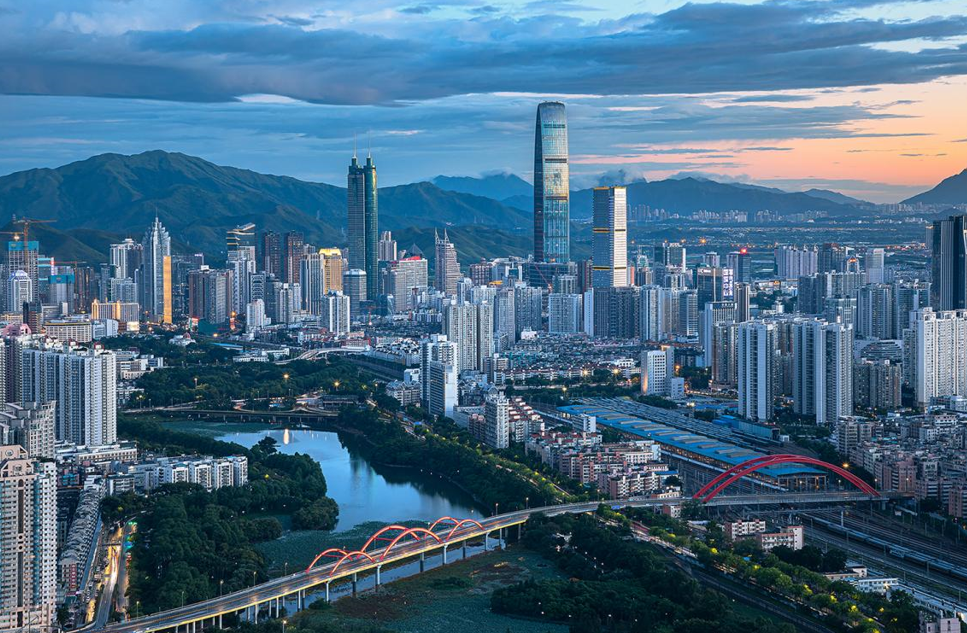 在深圳市洪湖公园上空俯瞰罗湖城区。近处,芙蓉大桥和彩虹桥蜿蜒相映,远处,京基100和地王大厦并肩矗立在落日余晖中。车水马龙,霓虹渐起,繁华热闹的夜色即将拉开帷幕。