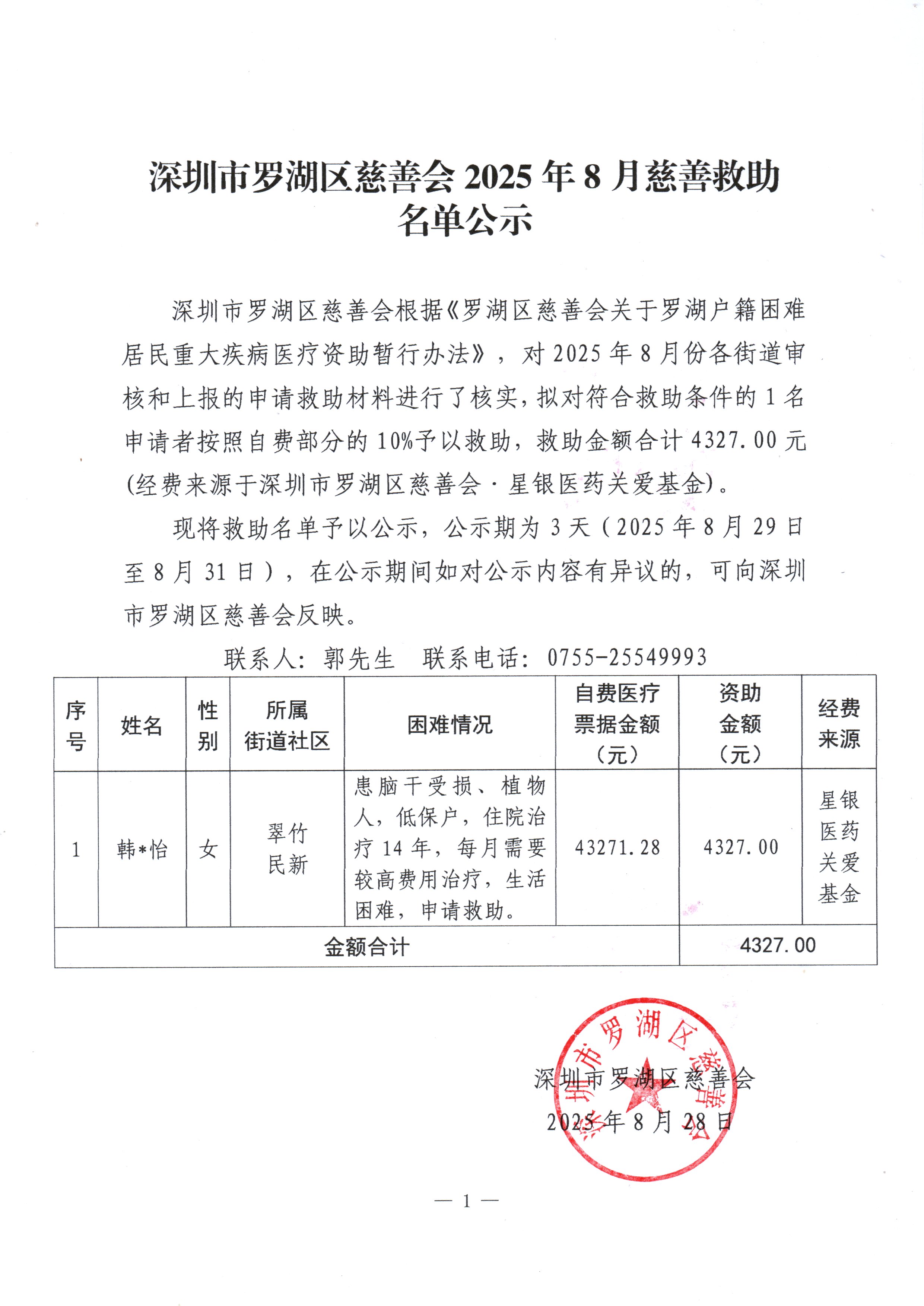 深圳市罗湖区慈善会2025年8月慈善救助名单公示