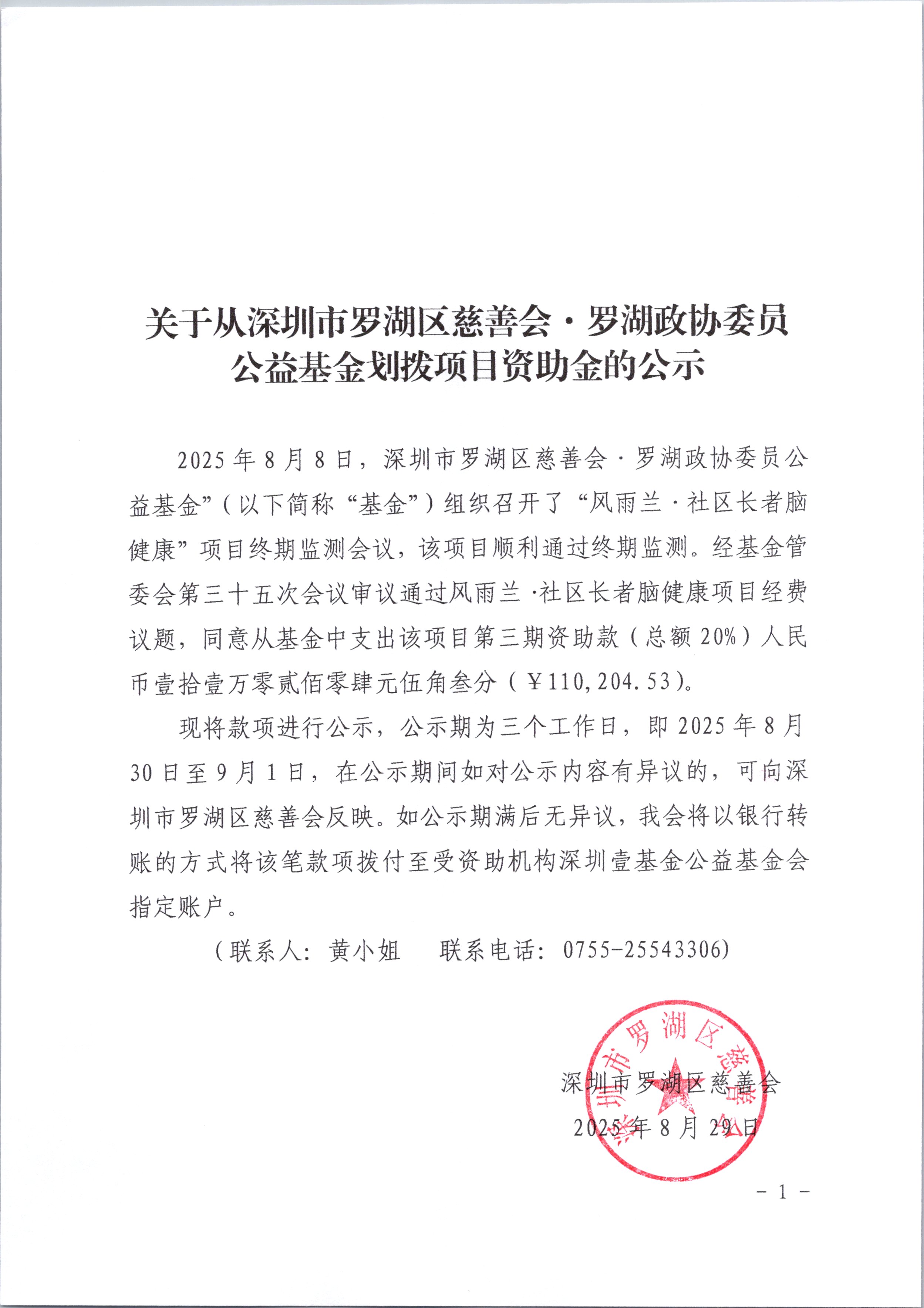 2025年8月8日,深圳市罗湖区慈善会·罗湖政协委员公益基金”(以下简称“基金”)组织召开了“风雨兰·社区长者脑健康”项目终期监测会议,该项目顺利通过终期监测。经基金管委会第三十五次会议审议通过风雨兰·社区长者脑健康项目经费议题,同意从基金中支出该项目第三期资助款(总额20%)人民币壹拾壹万零贰佰零肆元伍角叁分(¥110,204.53)。