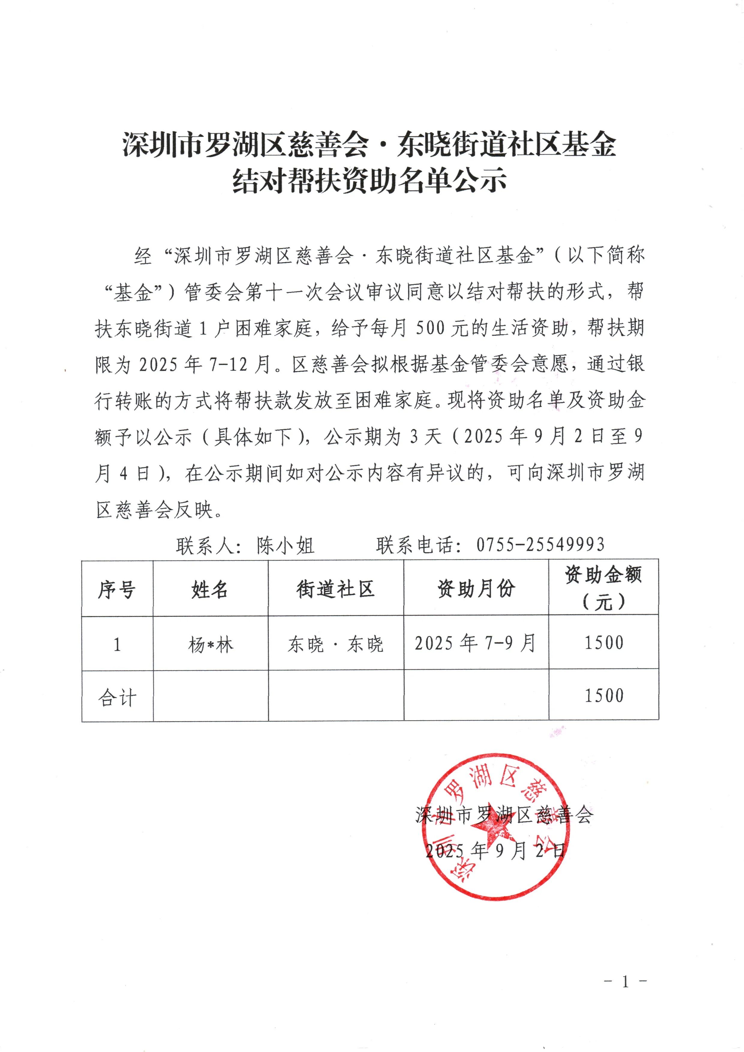 经“深圳市罗湖区慈善会·东晓街道社区基金”(以下简称“基金”)管委会第十一次会议审议同意以结对帮扶的形式,帮扶东晓街道1户困难家庭,给予每月500元的生活资助,帮扶期限为2025年7-12月。区慈善会拟根据基金管委会意愿,通过银行转账的方式将帮扶款发放至困难家庭。现将资助名单及资助金额予以公示。具体如下: