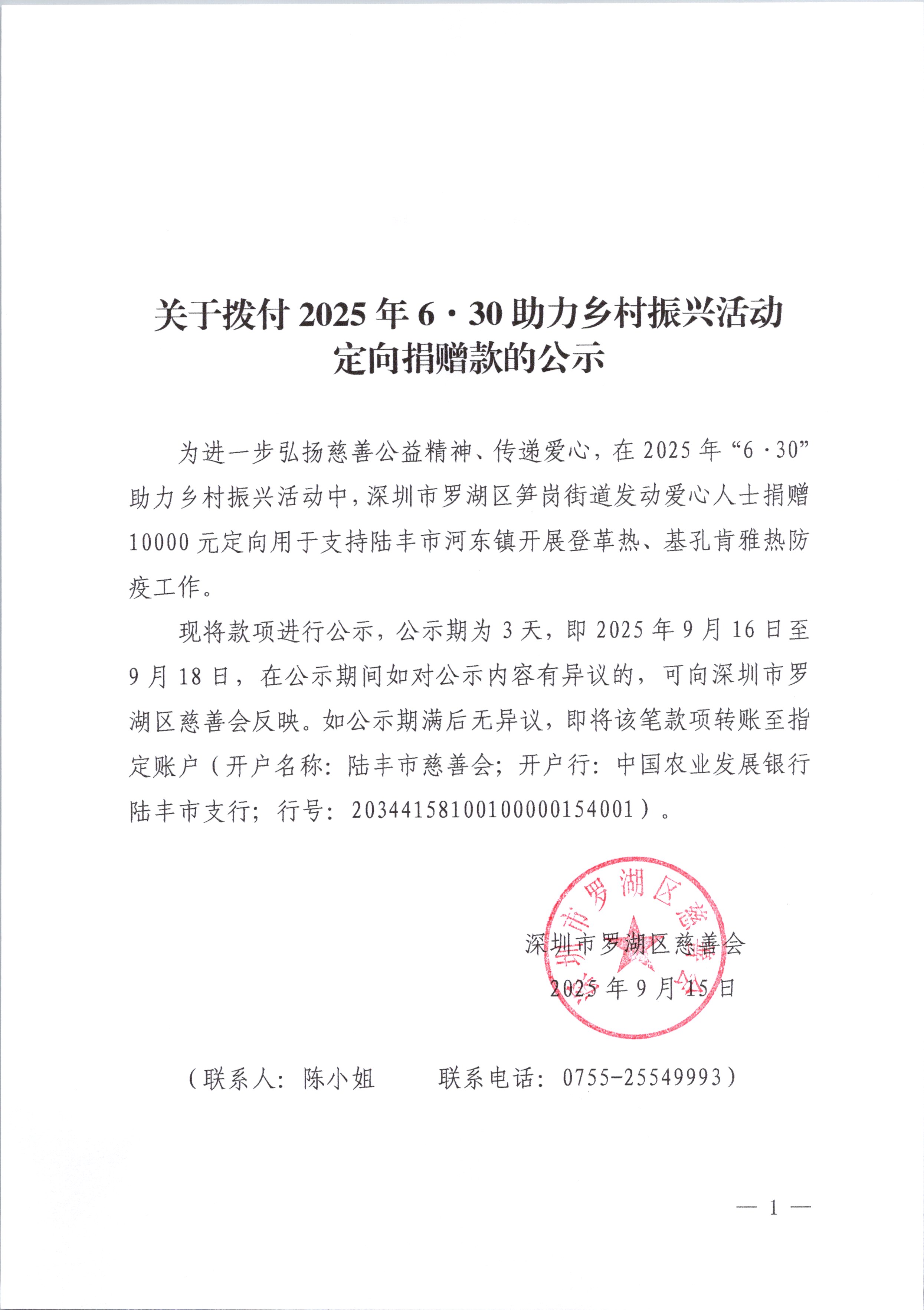 为进一步弘扬慈善公益精神、传递爱心,在2025年“6·30”助力乡村振兴活动中,深圳市罗湖区笋岗街道发动爱心人士捐赠10000元定向用于支持陆丰市河东镇开展登革热、基孔肯雅热防疫工作。
