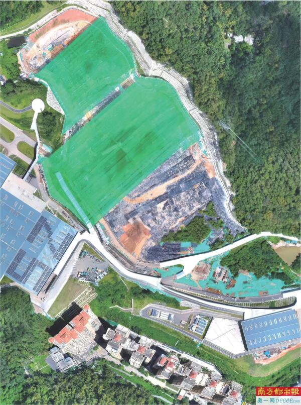 罗湖家园网讯:俯瞰罗湖玉龙填埋场环境修复工程。据悉,罗湖玉龙填埋场垃圾治理总量255.15万立方米,治理规模为目前国内最大;三面环山,地形高差达70米,最大开挖深度约52.4米;毗邻城市中心区域,周边居民多,施工要求高。罗湖区城管局供图。