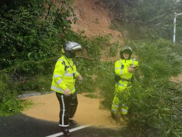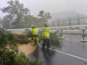 与此同时,沙湾大望桥发生山体滑坡,泥土断枝占据路面,造成交通中断。险情发生后,罗湖交警迅速赶赴现场处置。他们在滑坡路段两端设置警示标志,拉起警戒线,并引导车辆绕行,耐心安抚滞留司机情绪,牢牢守住安全防线。同时,其他人员全力清理路面上的土石与断枝。经过两小时的紧张奋战,路面障碍被彻底清除,该路段交通逐步恢复正常。