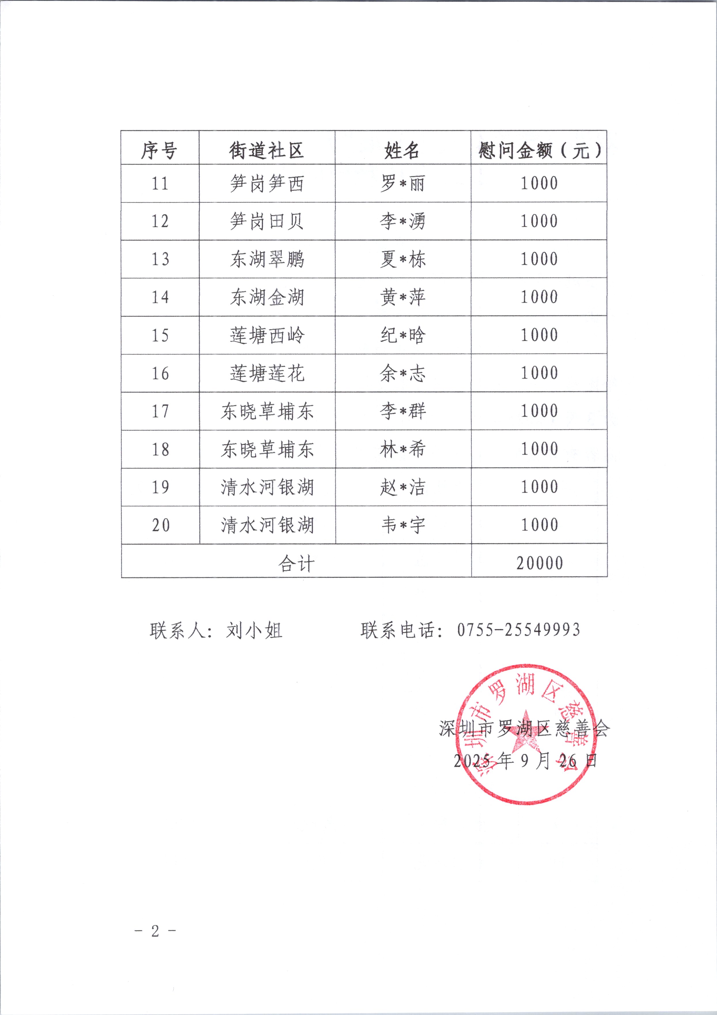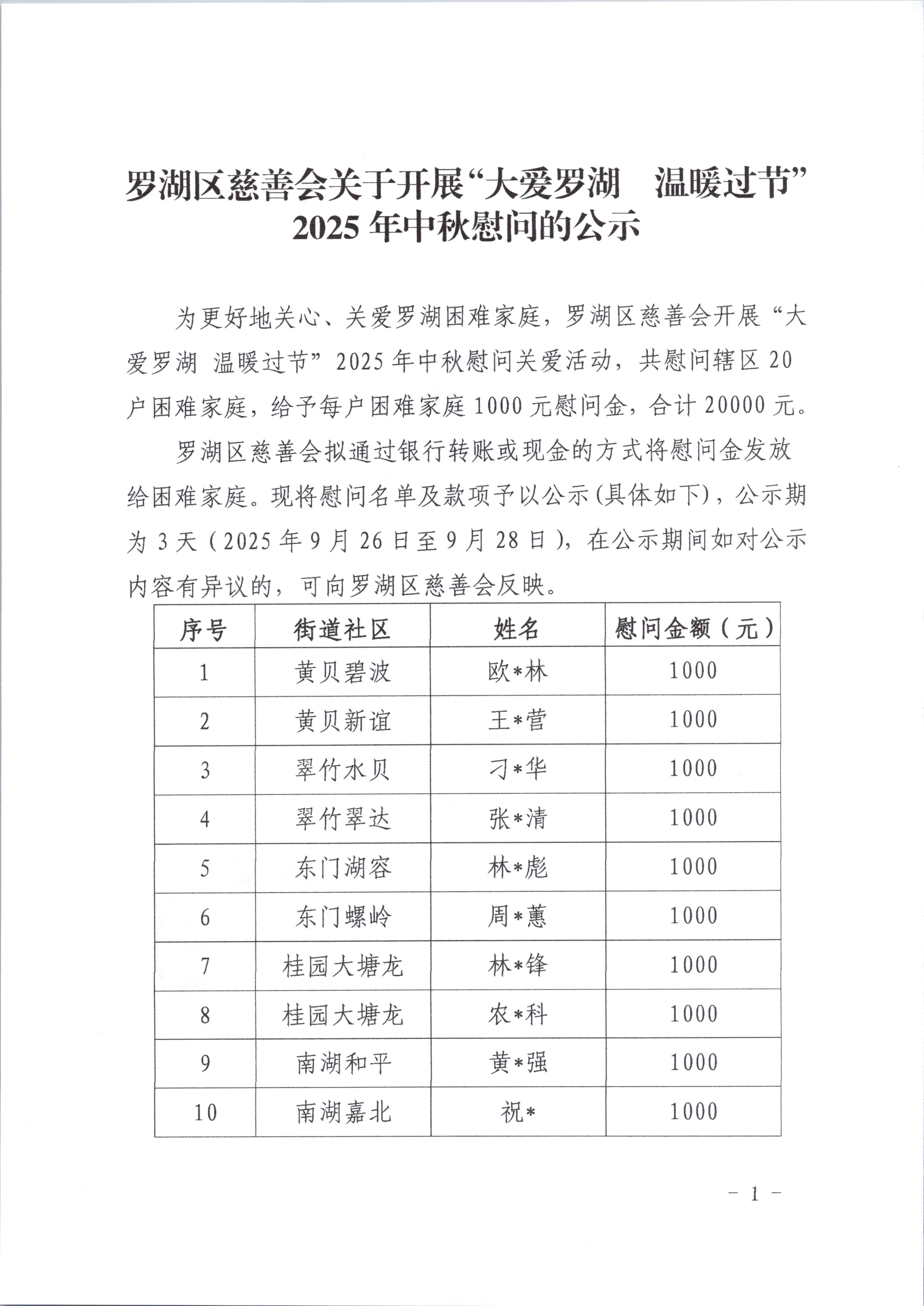 罗湖区慈善会拟通过银行转账或现金的方式将慰问金发放给困难家庭。现将慰问名单及款项予以公示,具体如下。