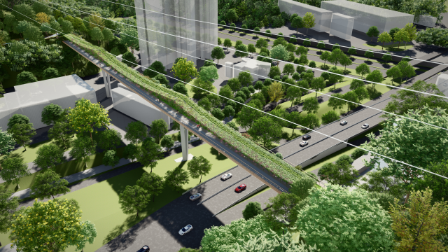 而“长廊桥”即在公园上方将架起两座均超200m的“生态廊桥”,桥面一侧是行人步道、另一侧保留灌丛等自然植被,形成“人在廊下走,兽在林中行”的长线绿带。二者连点成线就形成“小跳岛+长廊桥”结构,最终把银湖山—红岗公园—围岭山真正缝成一条3 km连续的山脊生态廊道。
