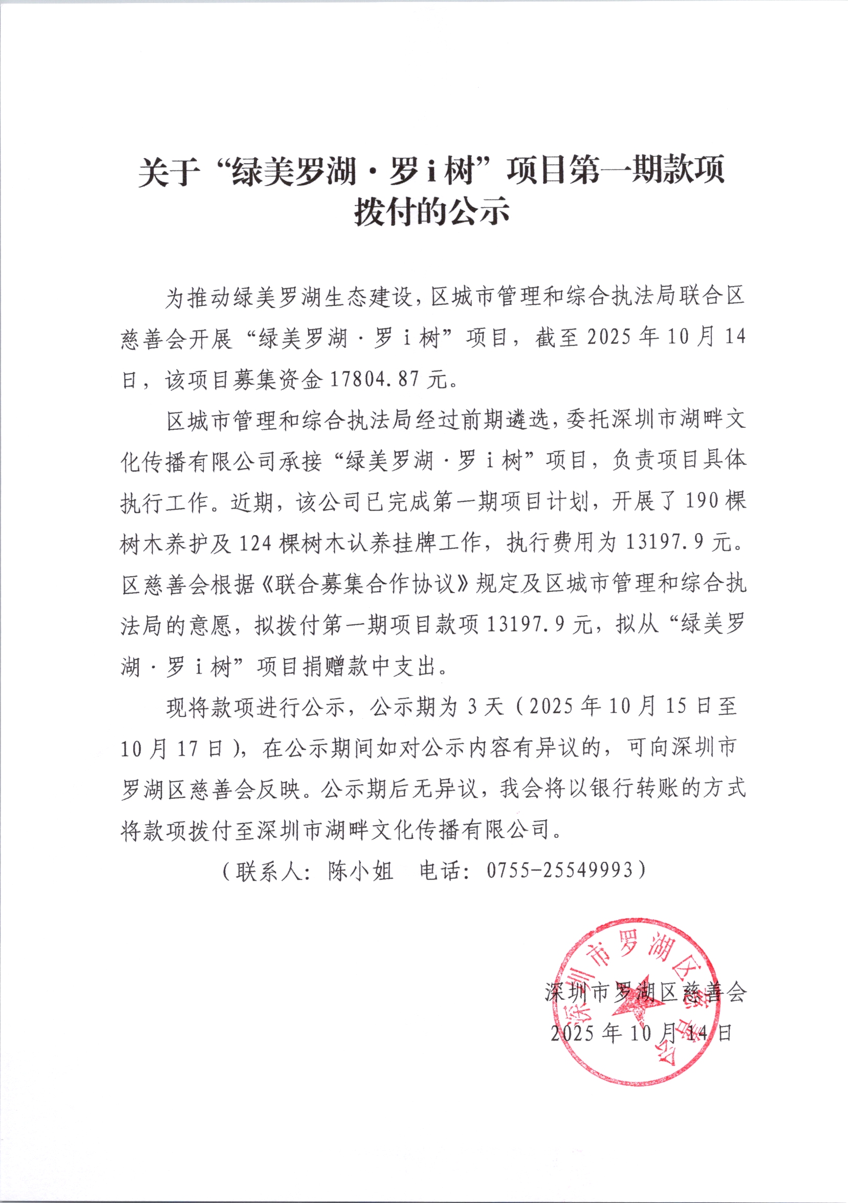 关于“绿美罗湖·罗i树”项目第一期款项拨付的公示