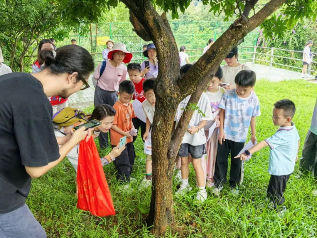 雨后的公园草木青翠、空气清新,成为最鲜活的“自然课堂”。一群停歇在树枝上、色彩艳丽的蜡蝉,瞬间吸引了孩子们的目光。“这是蜡蝉,也叫龙眼鸡,它的外形是不是很特别?”工作人员适时讲解,孩子们纷纷凑近观察,不时发出好奇的惊叹。随后,大家手持探索卡,在工作人员的引导下,细心辨别不同植物的叶片形状、叶脉纹理,记录其生长环境,在亲身体验中深化对本草植物的理解,感受自然造物的奇妙。