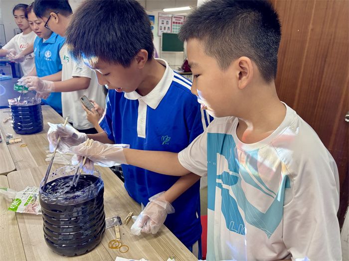 随后进入实践环节,社工先以云纹折叠法、蜘蛛纹缠绕法、包珠法为例,现场演示捆扎技巧,首先将环保袋与方巾浸泡湿润后,用棉线紧密缠绕、用珠子包裹固定,每一个步骤都讲解得清晰易懂。青少年们跃跃欲试,却也遇到不少难题,有的因力度不足导致布料松散,有的对染料浓度调配把握不准。社工及时巡回指导,帮助他们调整捆扎力度、掌握染料配比,还鼓励大家发挥想象力,尝试独特的捆扎方式。在染色环节,15 名青少年分成 5 组,围在装有靛蓝染料的小桶旁协作实践。当白色布料浸入染液,逐渐晕染出深浅不一的蓝色,大家忍不住发出惊叹。布料在染液中浸泡 10-20 分钟后,青少年们将其取出,在不拆开捆扎的情况下冲洗浮色,再进行固色处理。等待过程中,青少年们互相交流着各自的创作思路,分享动手的乐趣,充分展现了 “互助、共学” 的良好氛围。