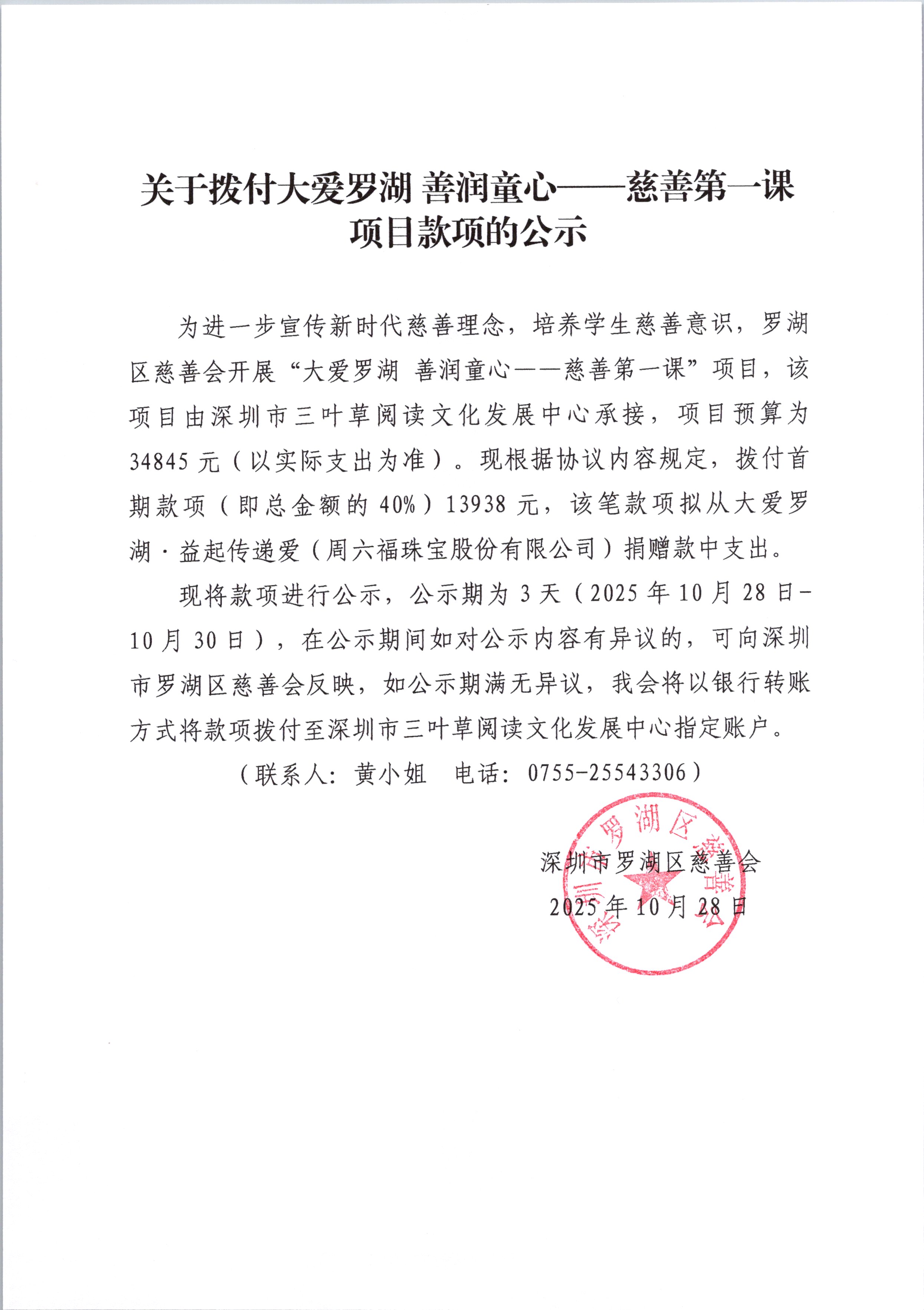 为进一步宣传新时代慈善理念,培养学生慈善意识,罗湖区慈善会开展“大爱罗湖 善润童心——慈善第一课”项目,该项目由深圳市三叶草阅读文化发展中心承接,项目预算为34845元(以实际支出为准)。现根据协议内容规定,拨付首期款项(即总金额的40%)13938元,该笔款项拟从大爱罗湖·益起传递爱(周六福珠宝股份有限公司)捐赠款中支出。