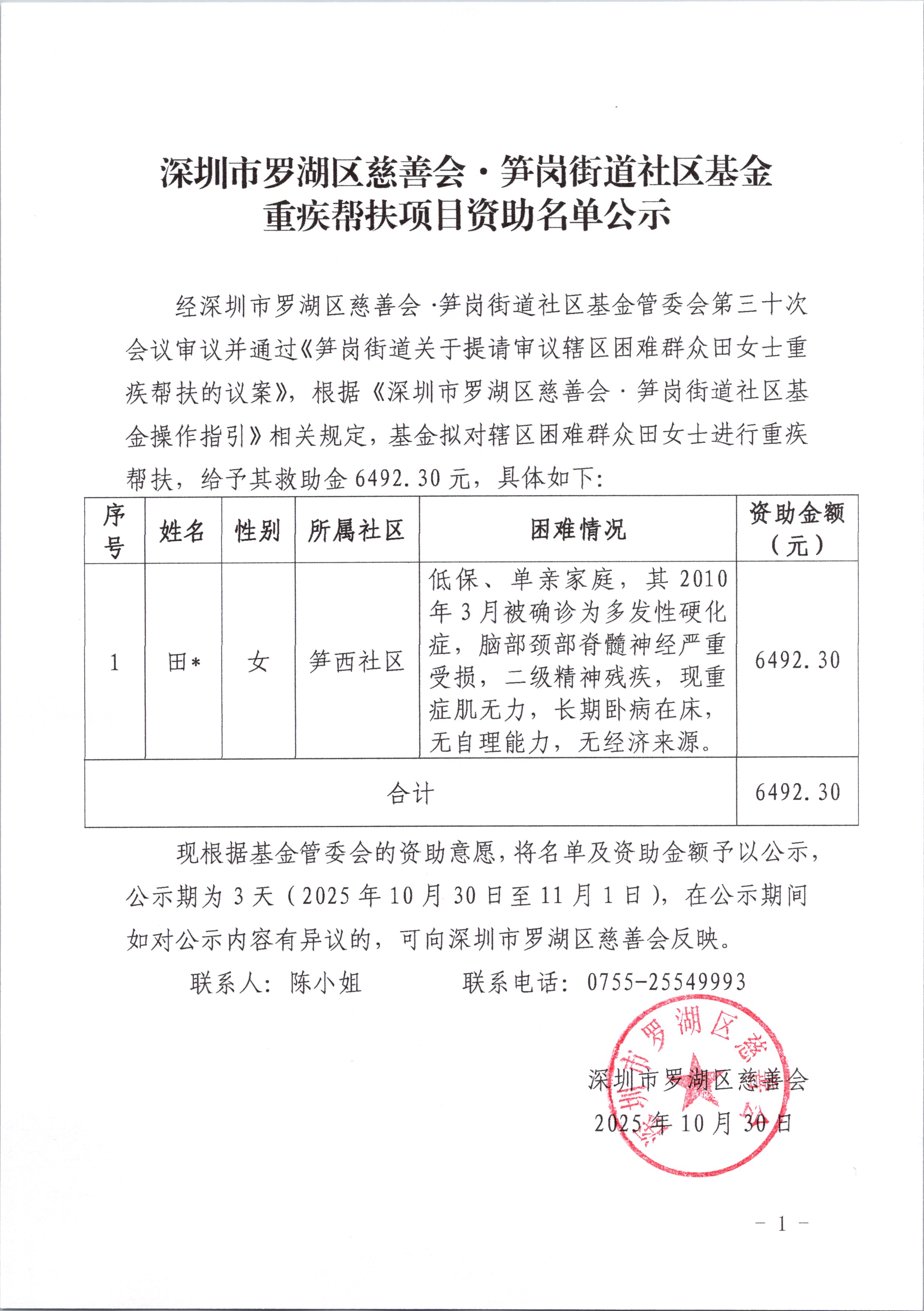 经深圳市罗湖区慈善会·笋岗街道社区基金管委会第三十次会议审议并通过《笋岗街道关于提请审议辖区困难群众田女士重疾帮扶的议案》,根据《深圳市罗湖区慈善会·笋岗街道社区基金操作指引》相关规定,基金拟对辖区困难群众田女士进行重疾帮扶,给予其救助金6492.30元,具体如下: