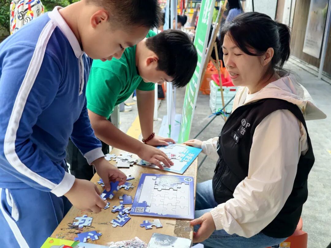 活动中,工作人员向学生发放了禁毒知识宣传手册,通过展示毒品仿真模型,详细介绍了毒品的种类、特征及其对个人和社会的危害,让学生初步建立了对毒品的认知。“禁毒宣传专区”还准备了“禁毒拼图大挑战”游戏道具和定制小礼品,从视觉到体验,全方位激发同学们的参与热情。活动一开场就吸引了大批同学驻足,有单人或组队两种方式参与,只要在规定时间内完成拼图即可获得奖励。“大家拼的时候注意看图案里的文字,‘珍爱生命,远离毒品’这句话要记在心里!” 社工在旁提醒道。