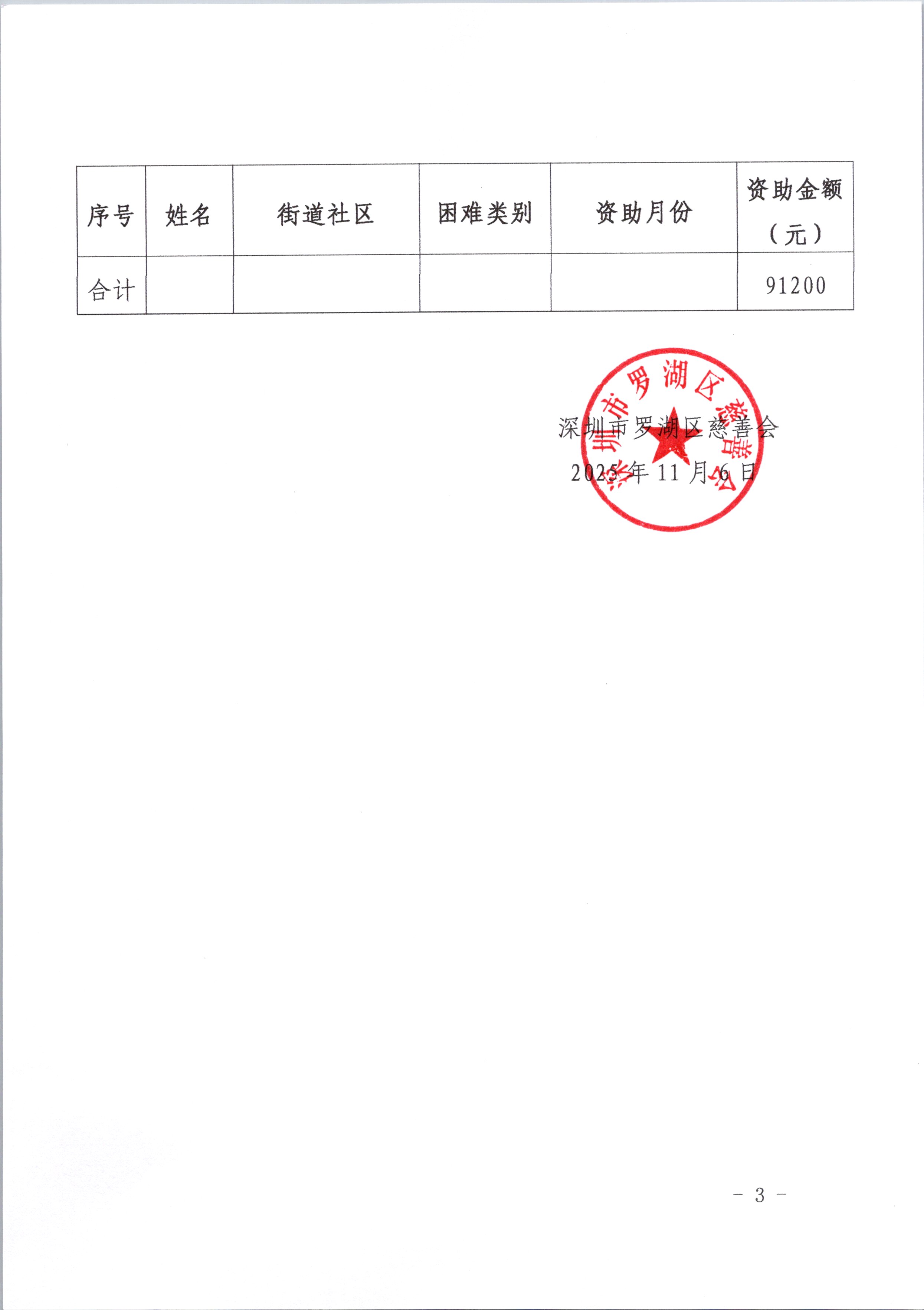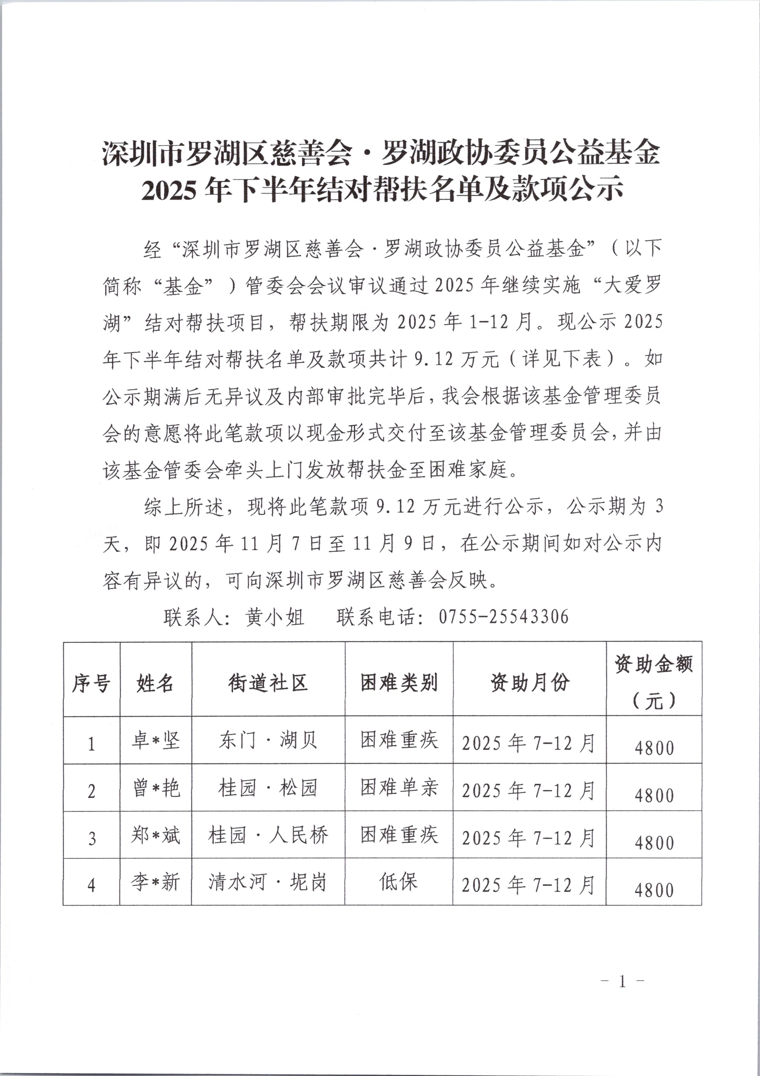 经“深圳市罗湖区慈善会·罗湖政协委员公益基金”(以下简称“基金”)管委会会议审议通过2025年继续实施“大爱罗湖”结对帮扶项目,帮扶期限为2025年1-12月。现公示2025年下半年结对帮扶名单及款项共计9.12万元(详见下表)。如公示期满后无异议及内部审批完毕后,我会根据该基金管理委员会的意愿将此笔款项以现金形式交付至该基金管理委员会,并由该基金管委会牵头上门发放帮扶金至困难家庭。