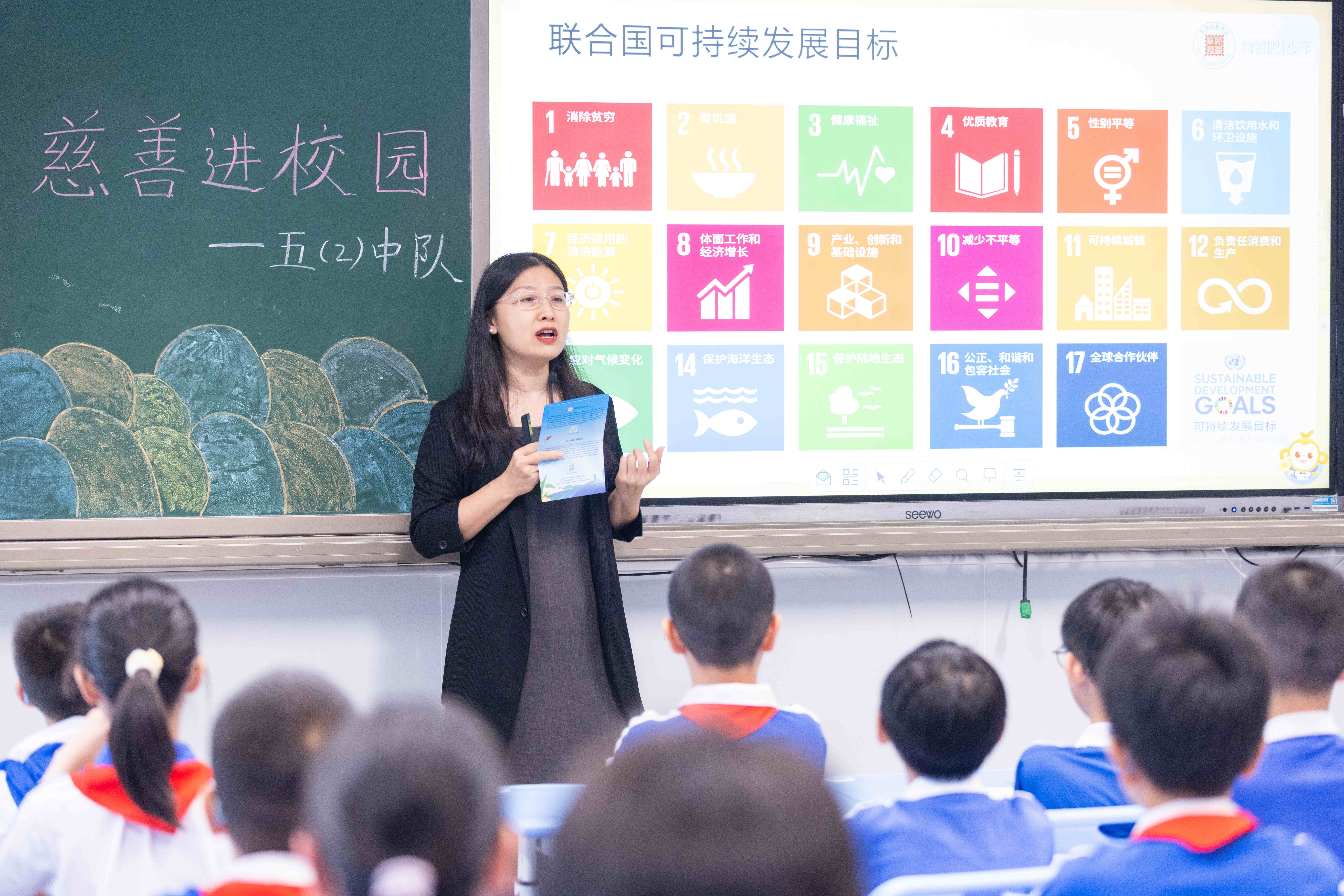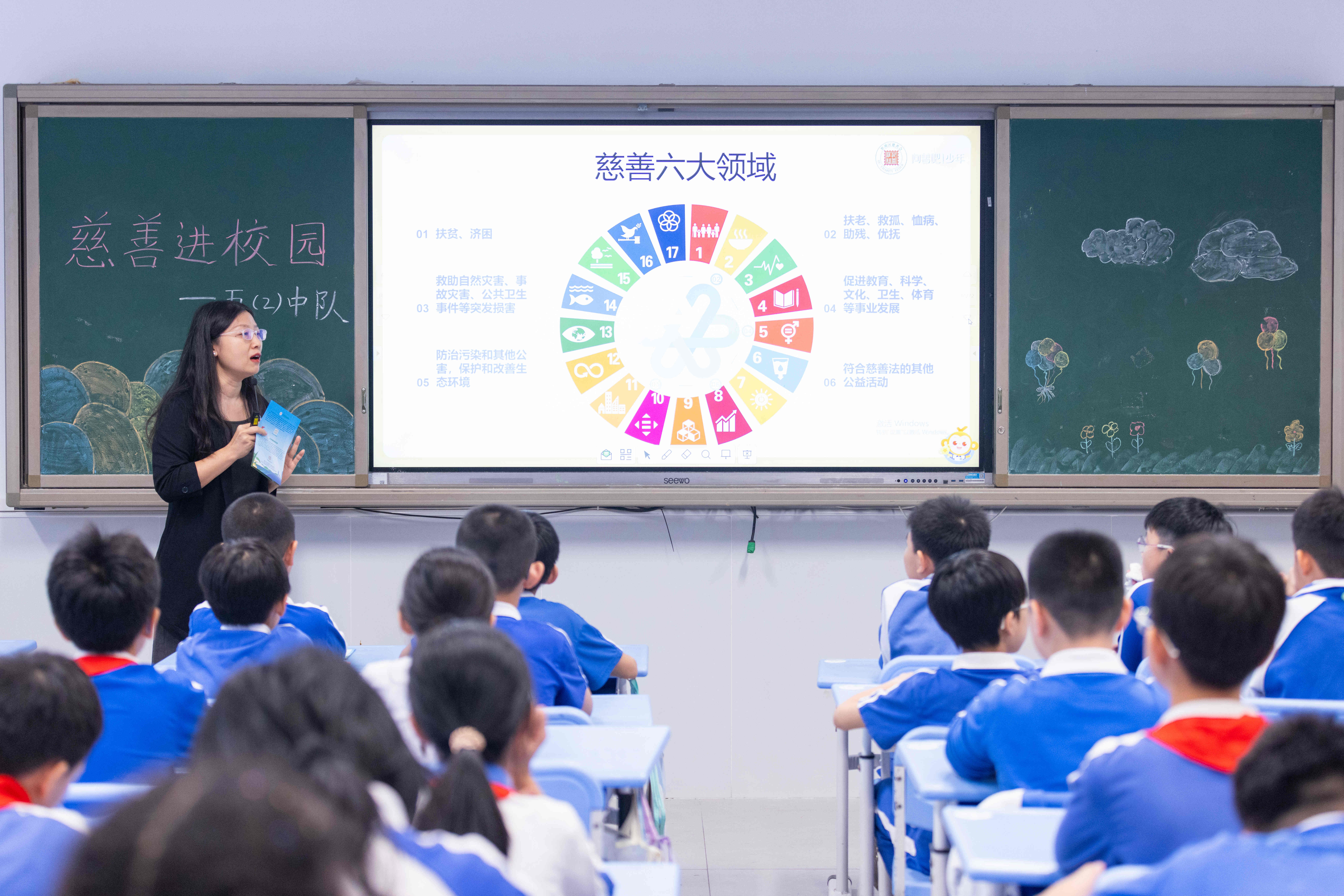 李老师巧妙串联联合国17项可持续发展目标与《慈善法》六大领域,将抽象概念转化为生活化表达。随后开展小组互动,同学们各自认领慈善方向,讨论可行行动,在交流中深化理解。