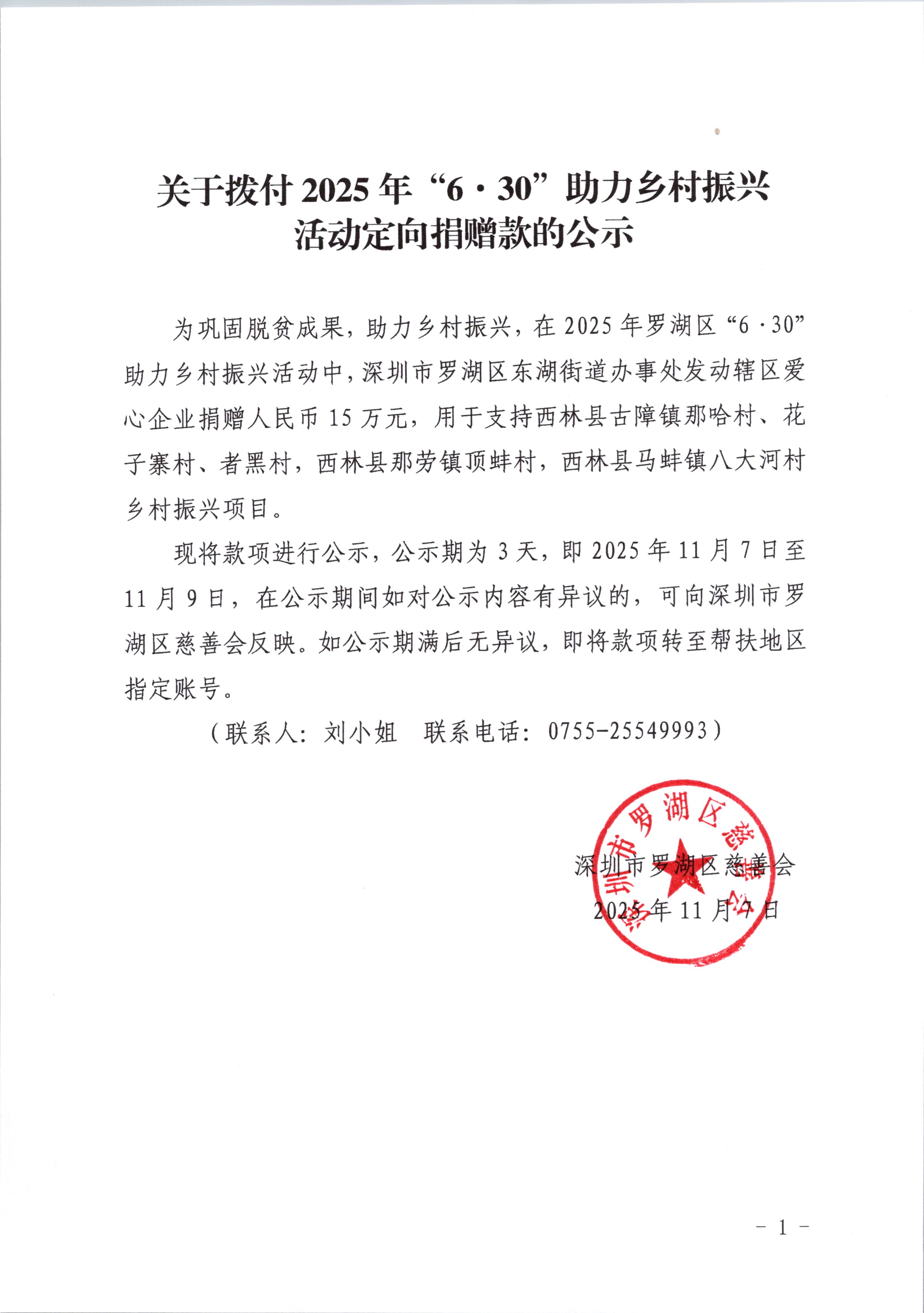 为巩固脱贫成果,助力乡村振兴,在2025年罗湖区“6·30”助力乡村振兴活动中,深圳市罗湖区东湖街道办事处发动辖区爱心企业捐赠人民币15万元,用于支持西林县古障镇那哈村、花子寨村、者黑村,西林县那劳镇顶蚌村,西林县马蚌镇八大河村乡村振兴项目。