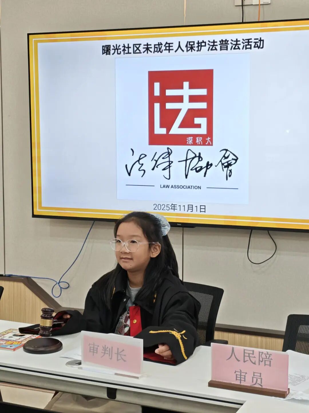 活动现场,深圳职业技术大学法律协会会长带领社区青少年完整还原了“校园欺凌健康权纠纷案”的庭审全流程。活动精心设置了开庭准备、法庭调查、法庭辩论、合议庭评议、公开宣判五大环节,通过抽签方式让小朋友分别扮演审判长、原被告法定代理人等不同角色,零距离感受法庭的庄严与法律的权威。