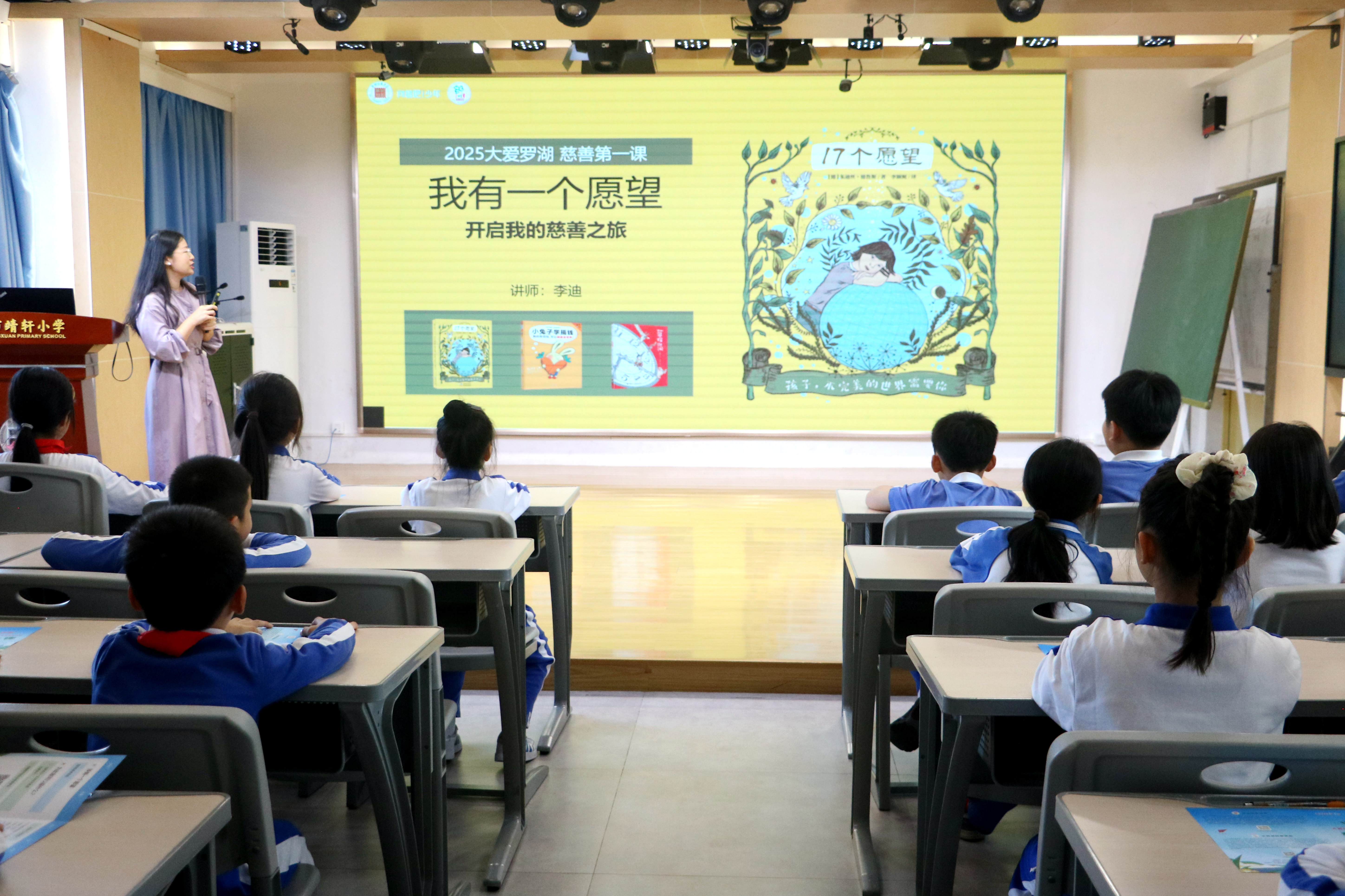 2025年11月6日,深圳市靖轩小学报告厅内暖意涌动,一场以“我有一个愿望——开启我的慈善之旅”为主题的慈善第一课校园宣讲活动在此开启。此次活动由罗湖区民政局、区教育局指导,罗湖区慈善会与靖轩小学联合主办,爱心企业周六福珠宝股份有限公司公益支持,三叶草故事家族创始人李迪老师负责主讲。罗湖区慈善会代表、靖轩小学校领导以及三(5)班和四(4)班全体师生参加活动。