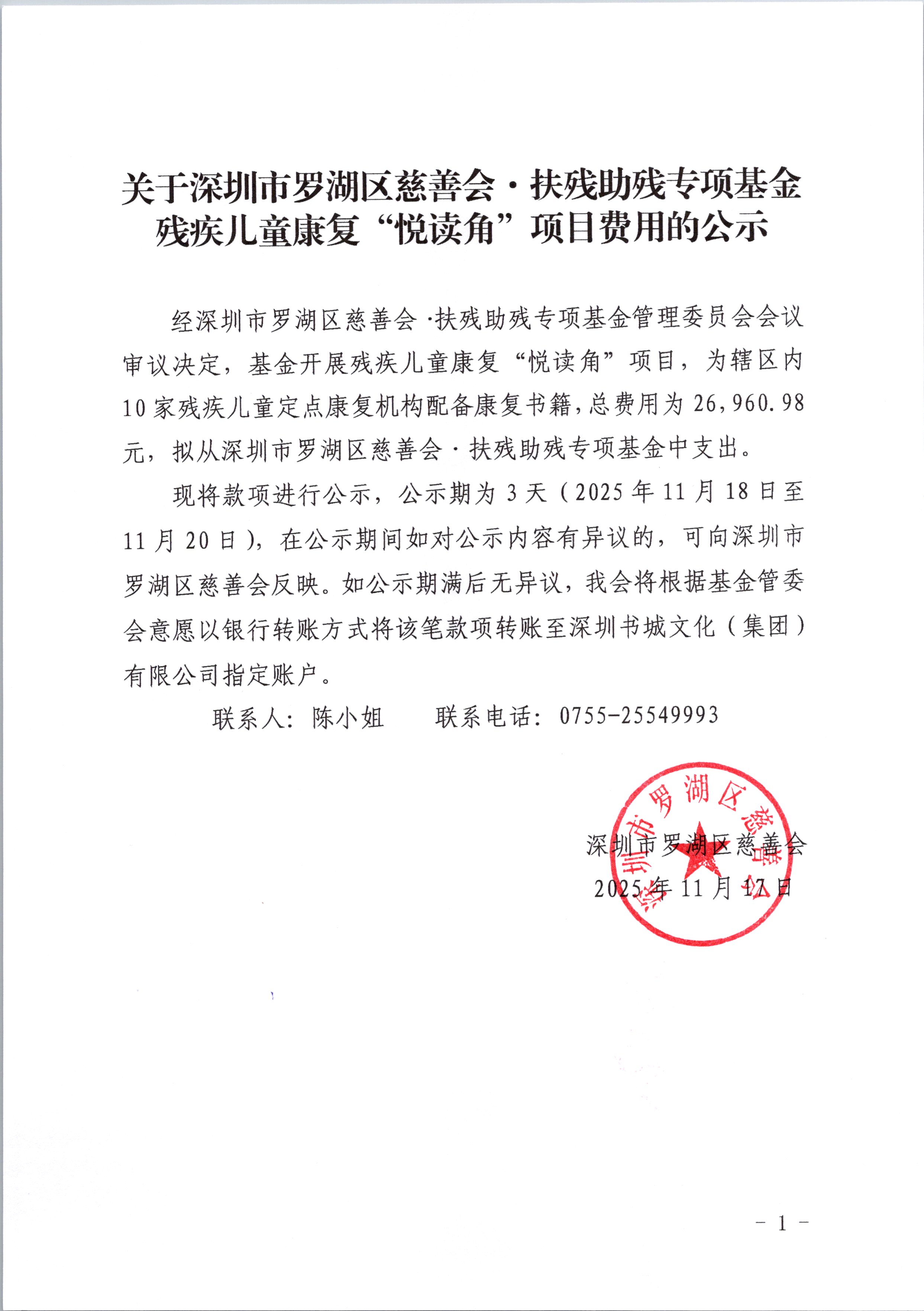 关于深圳市罗湖区慈善会·扶残助残专项基金残疾儿童康复“悦读角”项目费用的公示