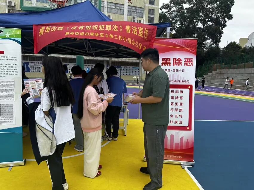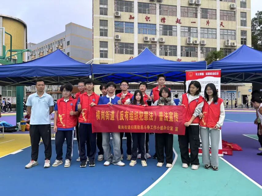 为进一步增强青少年的法治意识和自我保护能力,营造安全、和谐、法治的校园环境,11月10日,龙岗区横岗街道扫黑办在深圳市携创高级技工学校操场开展了一场别开生面的《中华人民共和国反有组织犯罪法》(以下简称“《反有组织犯罪法》”)进校园宣传活动,为广大师生带来了一堂生动的法治教育课。