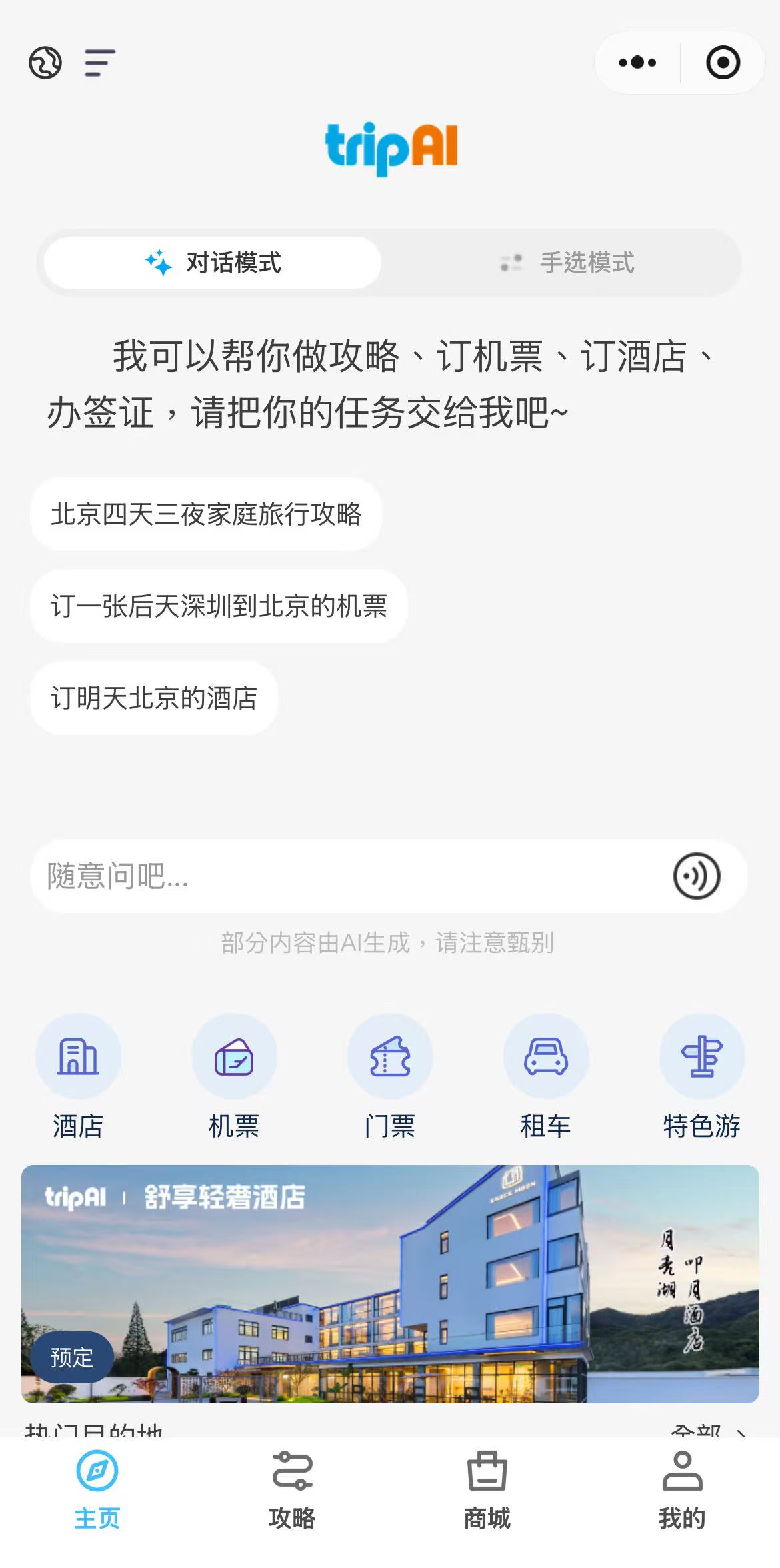 打开“Trip AI”小程序,其主界面设计简洁明了,核心的“对话模式”与“手选模式”并列,用户可根据自身习惯无缝切换。