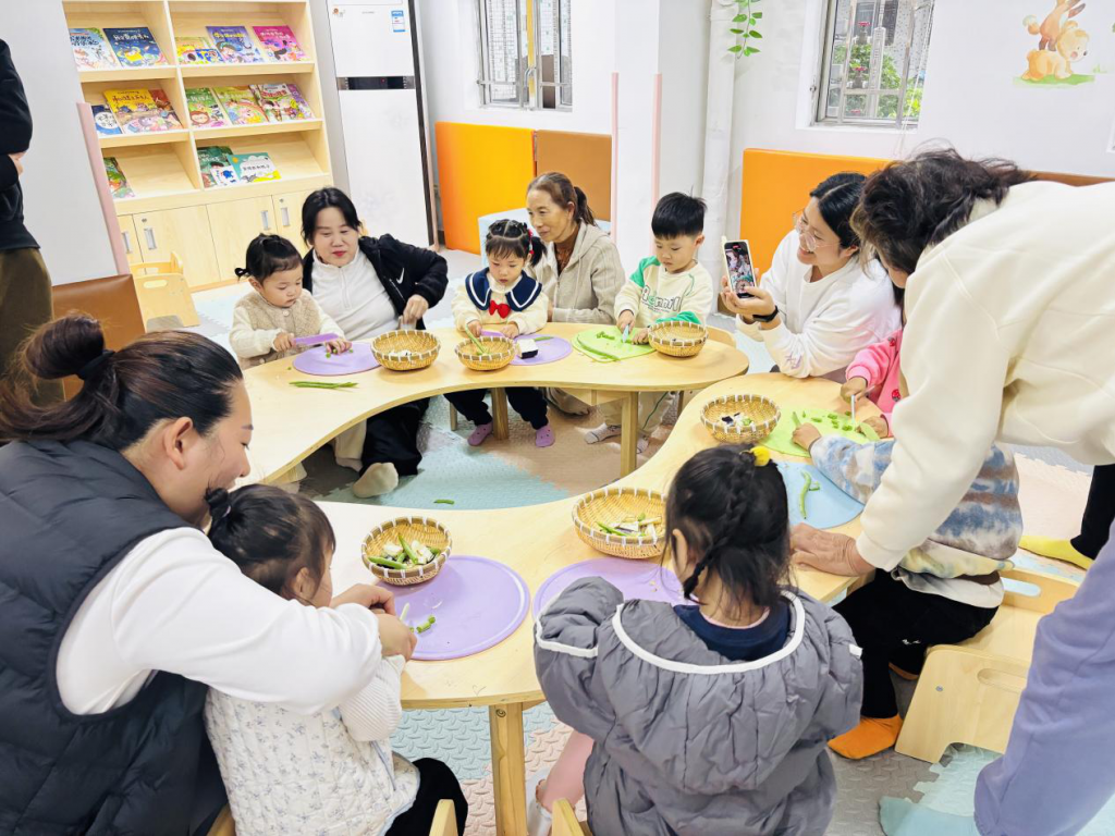 探索环节是活动的核心亮点。孩子们在指导老师和家长的帮助下,亲自动手,体验了手切萝卜、四季豆、茄子、红薯,以及剥玉米、剥花生等农事劳作。这不仅是一次新奇的实物操作体验,更是一堂生动的自然教育课,让孩子们深刻体会到“一粥一饭,当思来之不易”。随后,家庭齐心协作,将这些五彩斑斓的秋日果实精心摆盘、构图,开始他们的“晒秋”创作。