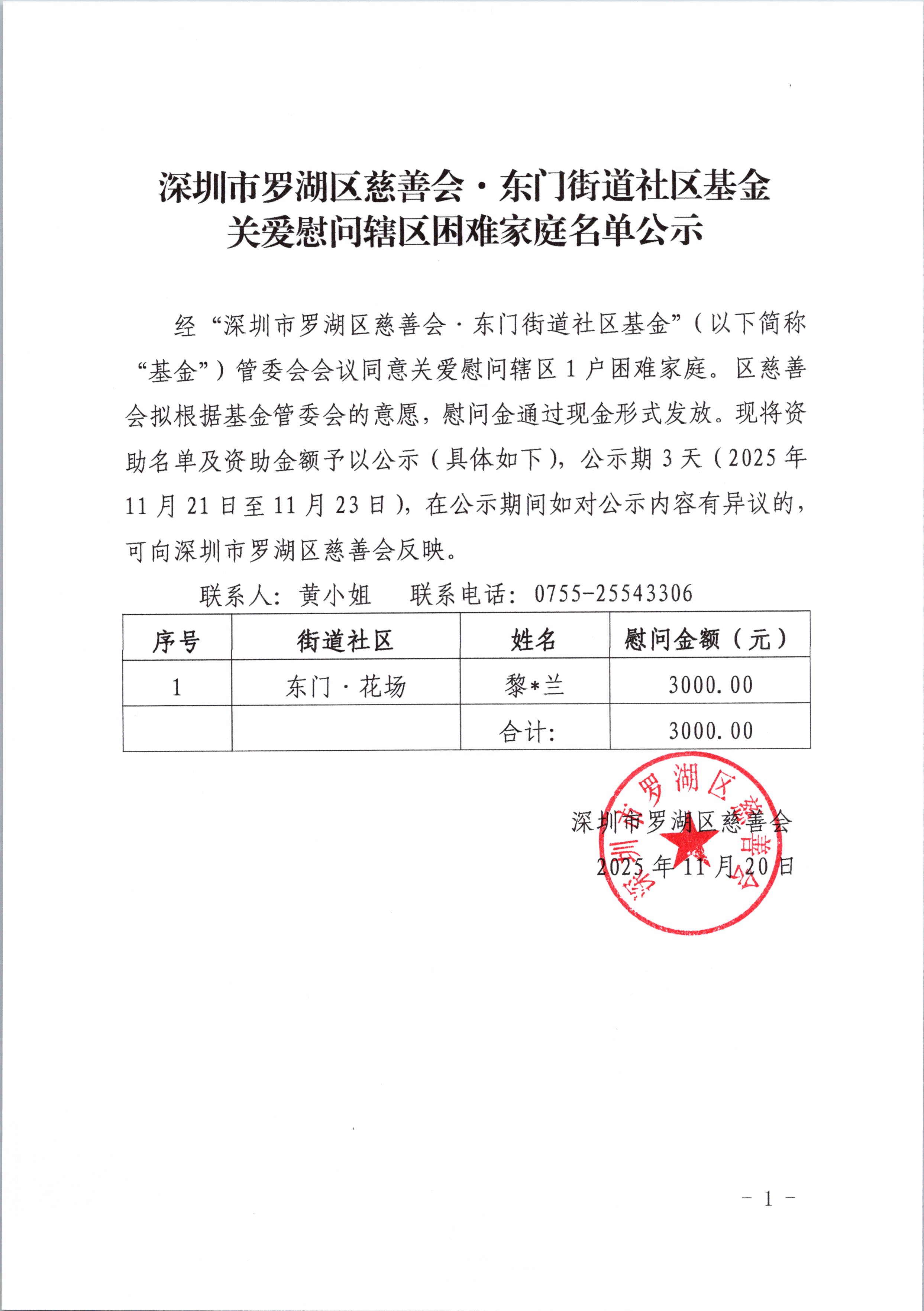 经“深圳市罗湖区慈善会·东门街道社区基金”(以下简称“基金”)管委会会议同意关爱慰问辖区1户困难家庭。区慈善会拟根据基金管委会的意愿,慰问金通过现金形式发放。现将资助名单及资助金额予以公示,具体如下: