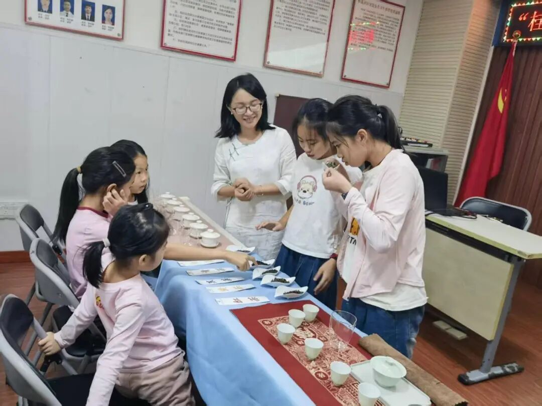 活动特别邀请龙华区职业技术学校茶艺老师授课。活动现场,茶艺师以“茶之初印象”为引,通过实物观察与故事讲述,带领孩子们初探茶文化脉络。在“六茶大侦探”环节,孩子们化身品茶人,通过触觉辨识干茶形态、嗅觉联想茶香类型、味觉对比汤色差异,系统掌握绿茶的“清汤绿叶”、红茶的“红汤红叶”等核心特征,直观感受六大茶类的地理分布与工艺差异。